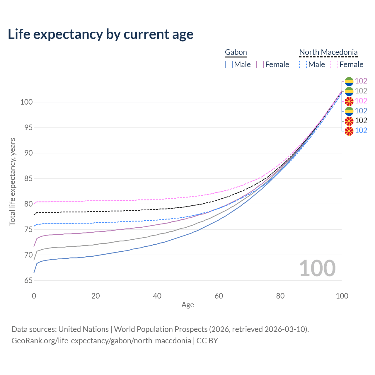 This life expectancy calculator shows the odds of living to 100, 95, 90, and below based on current age for both males and females in Gabon and North Macedonia, along with mean and median age of death. The calculations are based on the 2026 life tables (actuarial tables) from the UN World Population Prospects.
