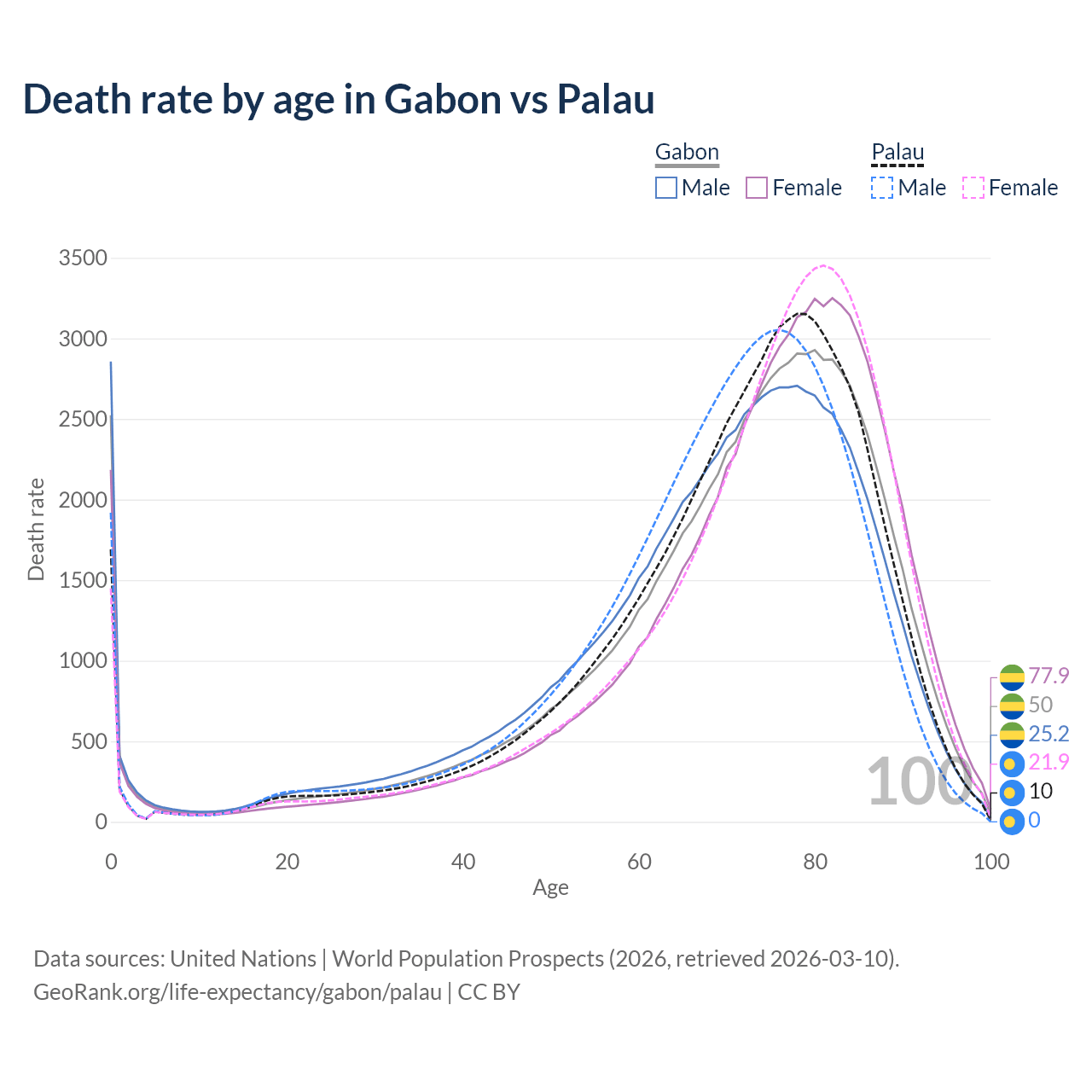 In Gabon, the most common age of death is 80, compared to 78 in Palau. The median age of death is 73.9 in Gabon and 73.8 in Palau, meaning only half of each cohort is expected to live past that age.