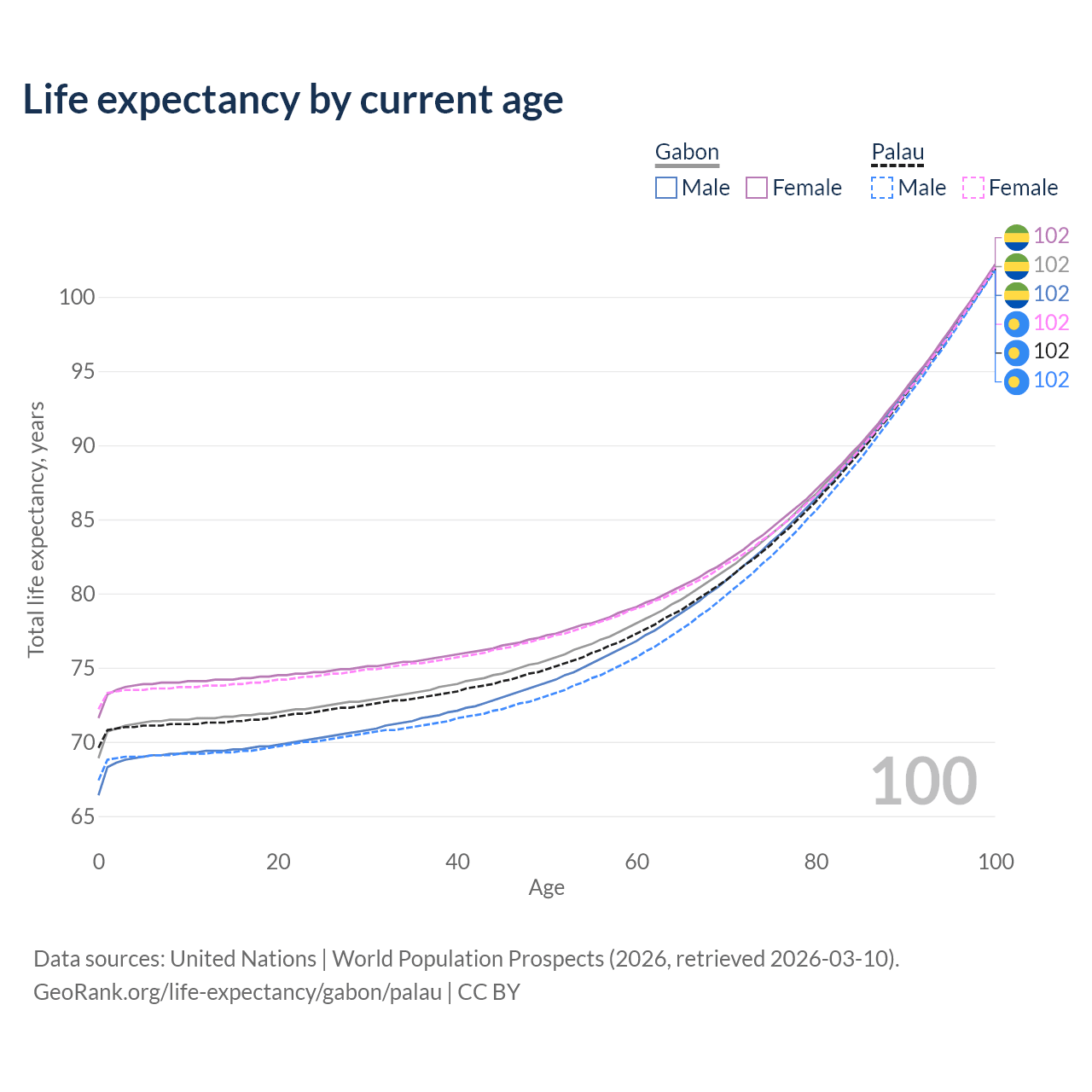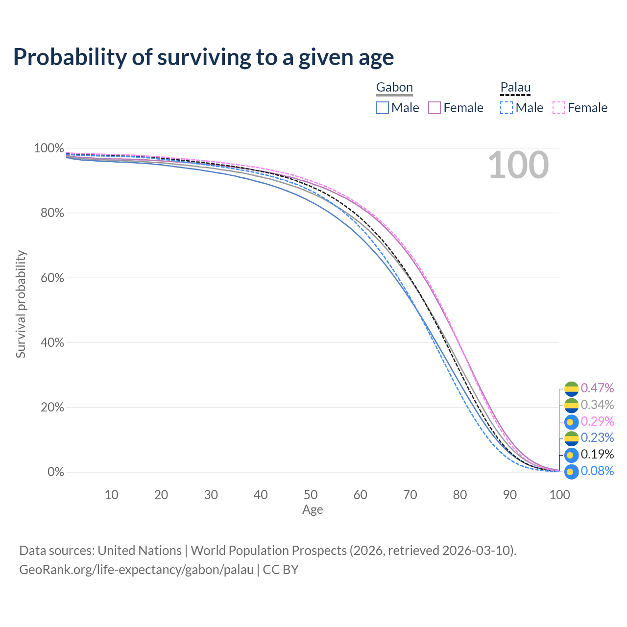 This life expectancy calculator shows the odds of living to 100, 95, 90, and below based on current age for both males and females in Gabon and Palau, along with mean and median age of death. The calculations are based on the 2026 life tables (actuarial tables) from the UN World Population Prospects.