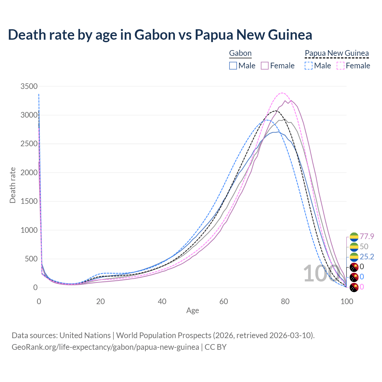 In Gabon, the most common age of death is 80, compared to 0 in Papua New Guinea. The median age of death is 73.9 in Gabon and 71.7 in Papua New Guinea, meaning only half of each cohort is expected to live past that age.