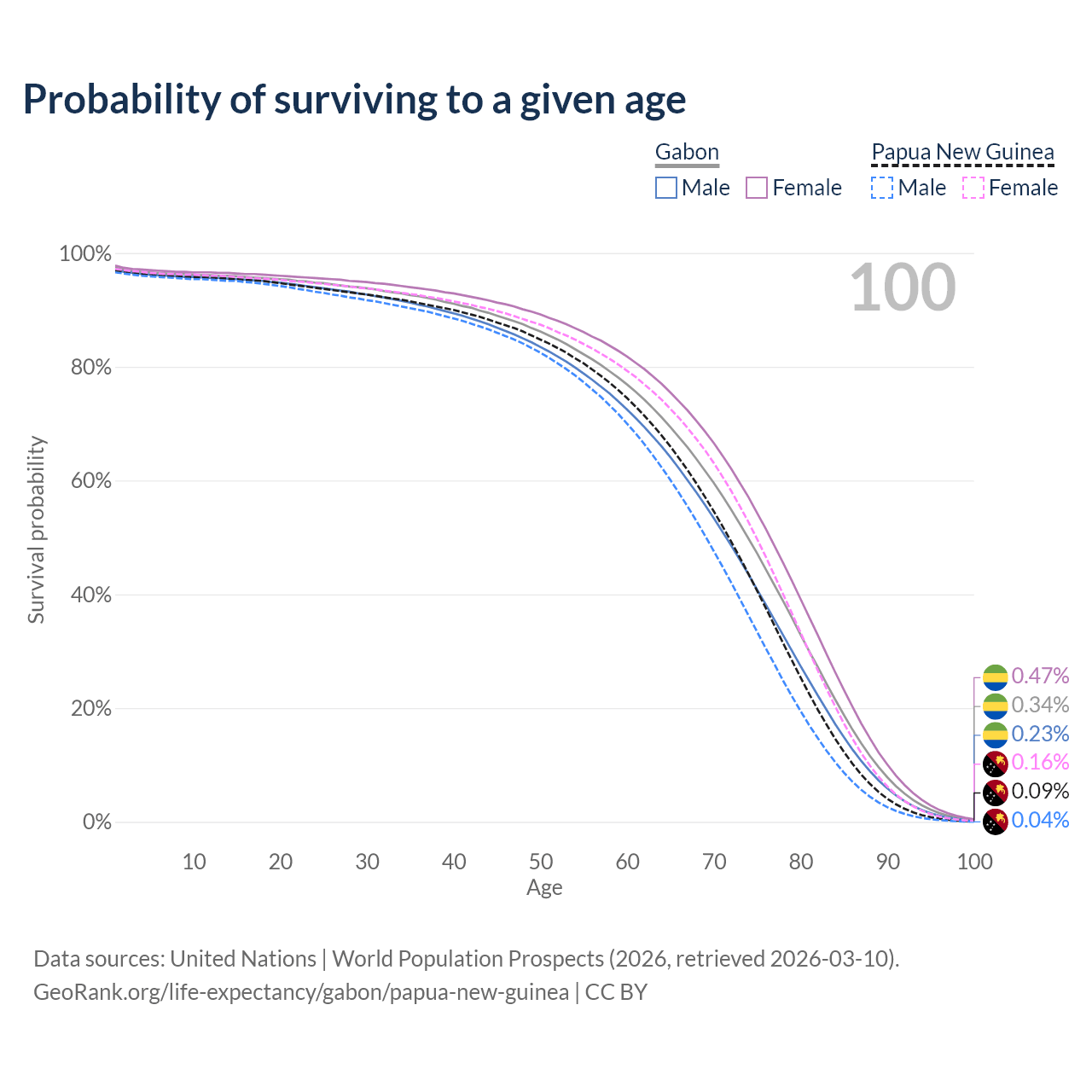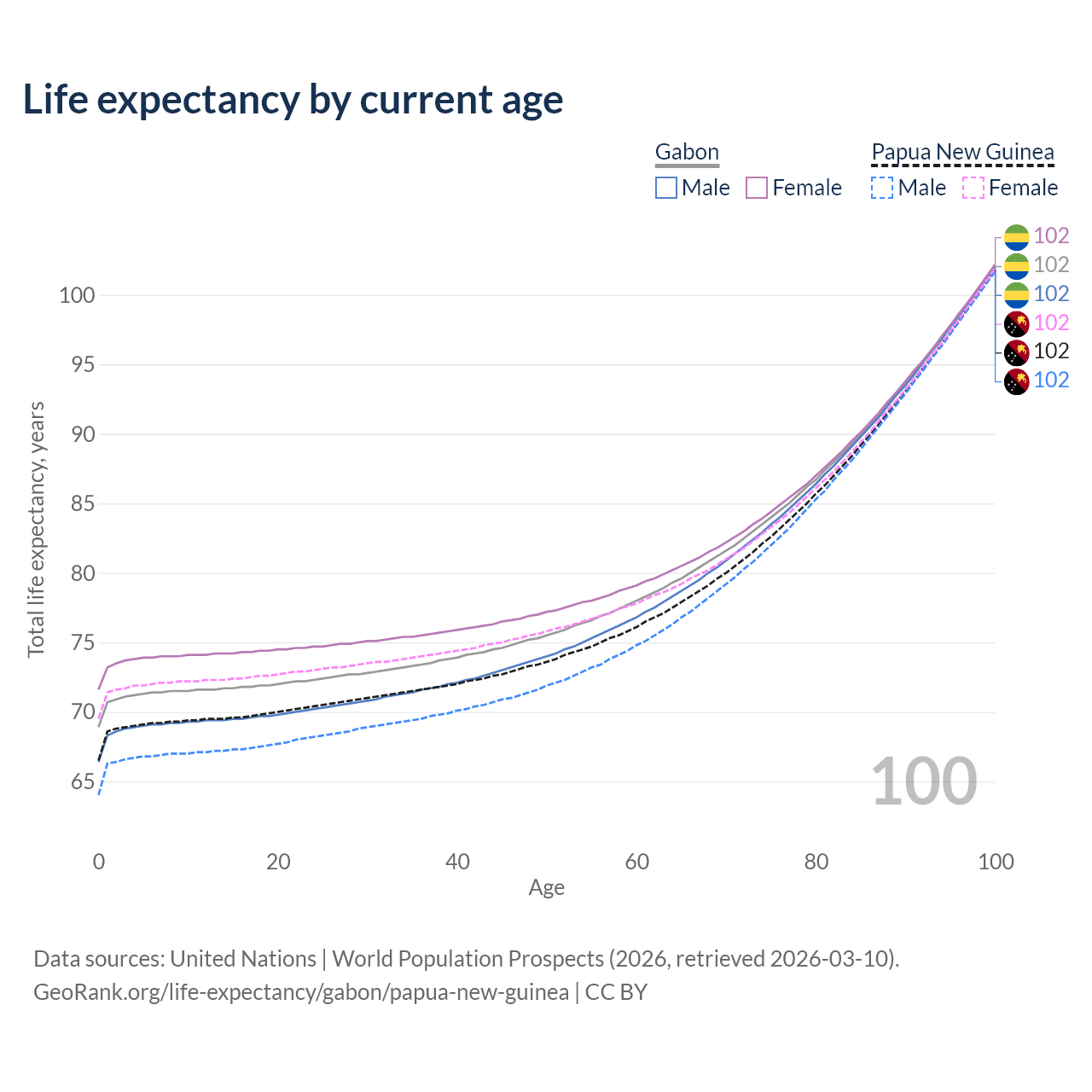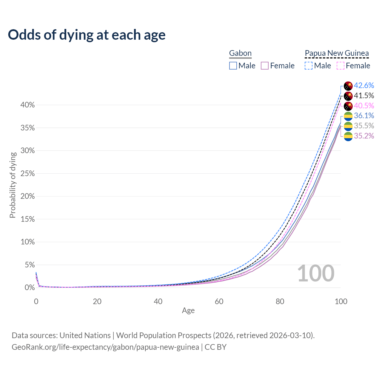 This life expectancy calculator shows the odds of living to 100, 95, 90, and below based on current age for both males and females in Gabon and Papua New Guinea, along with mean and median age of death. The calculations are based on the 2026 life tables (actuarial tables) from the UN World Population Prospects.