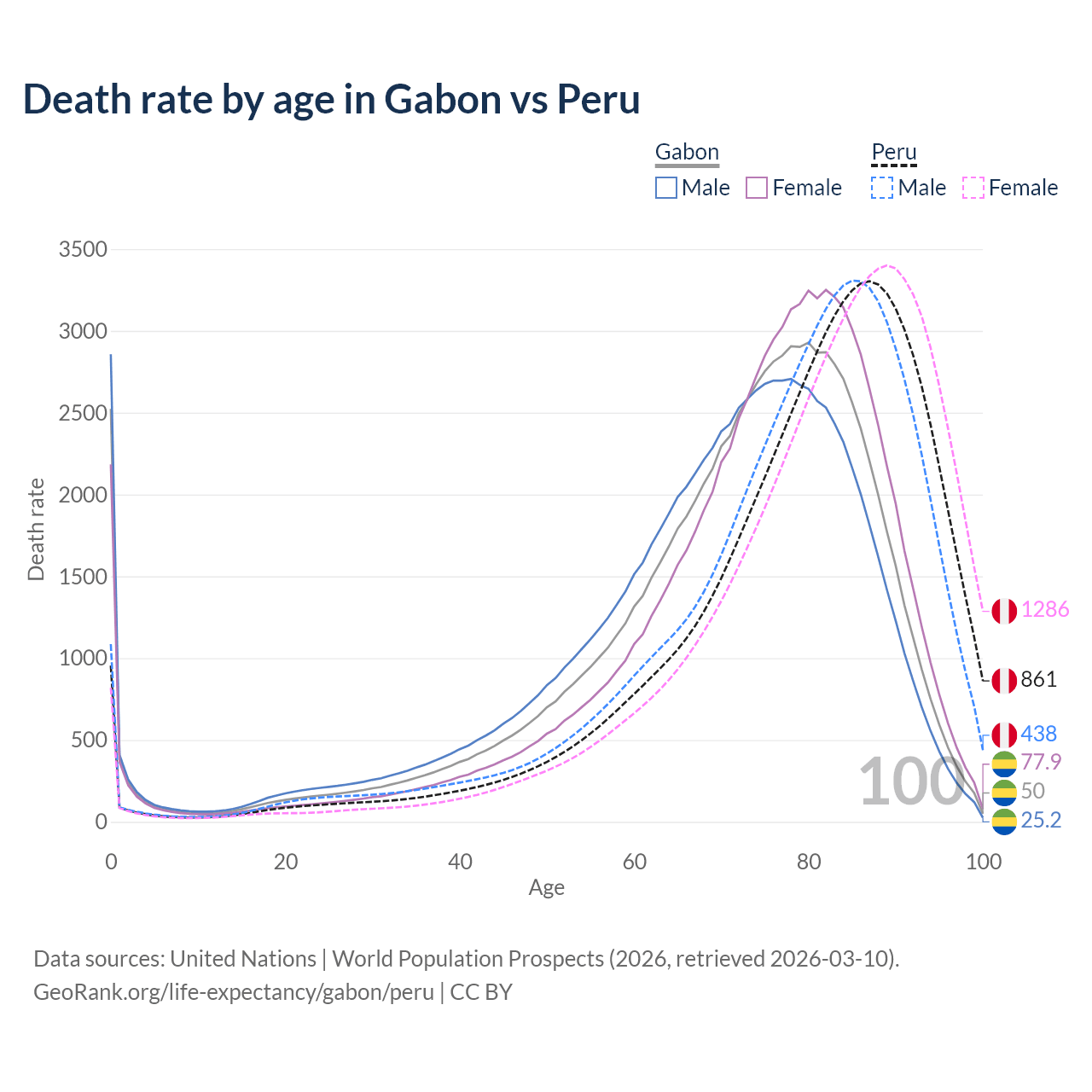 This life expectancy calculator shows the odds of living to 100, 95, 90, and below based on current age for both males and females in Gabon and Peru, along with mean and median age of death. The calculations are based on the 2026 life tables (actuarial tables) from the UN World Population Prospects.