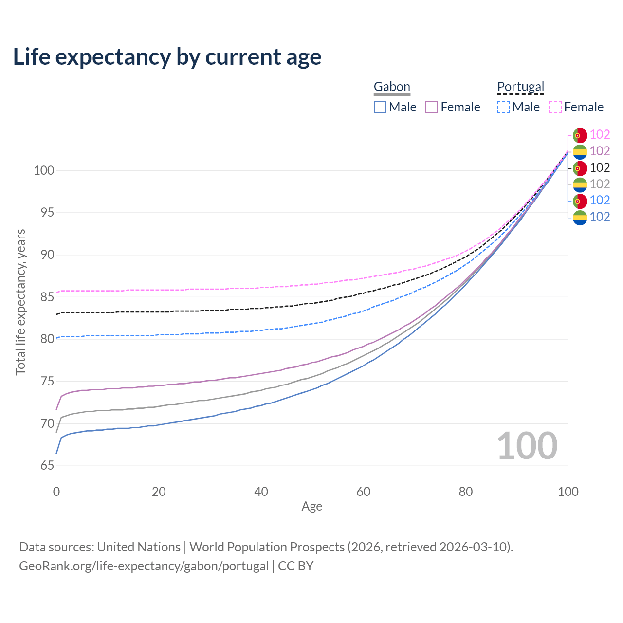 This life expectancy calculator shows the odds of living to 100, 95, 90, and below based on current age for both males and females in Gabon and Portugal, along with mean and median age of death. The calculations are based on the 2026 life tables (actuarial tables) from the UN World Population Prospects.