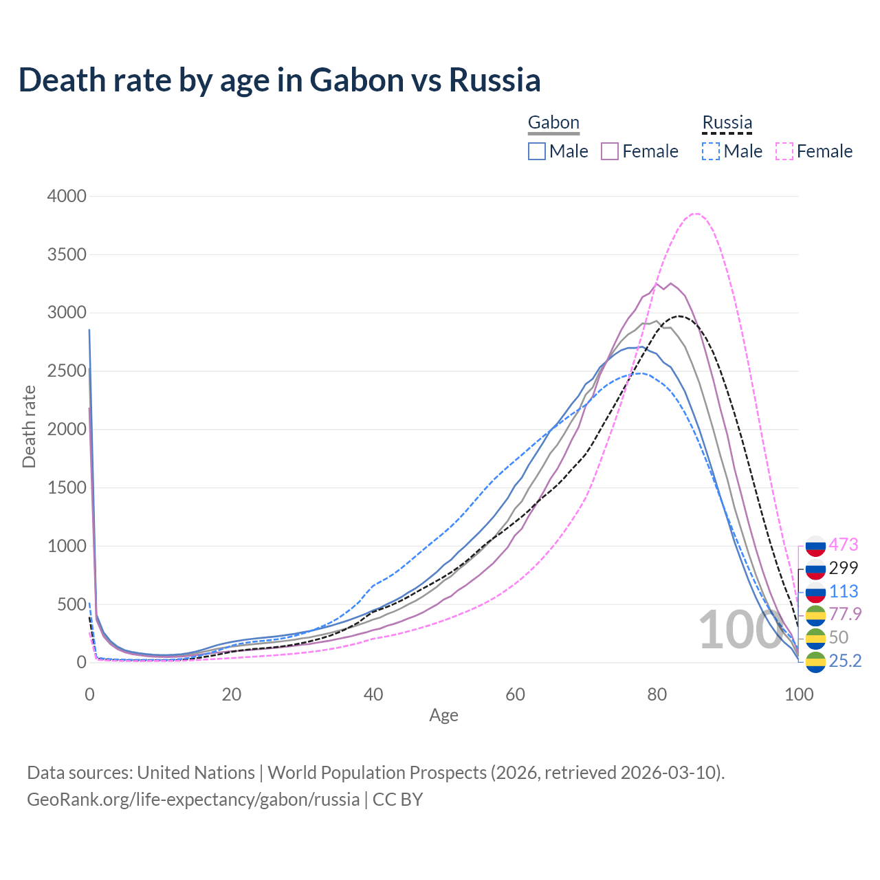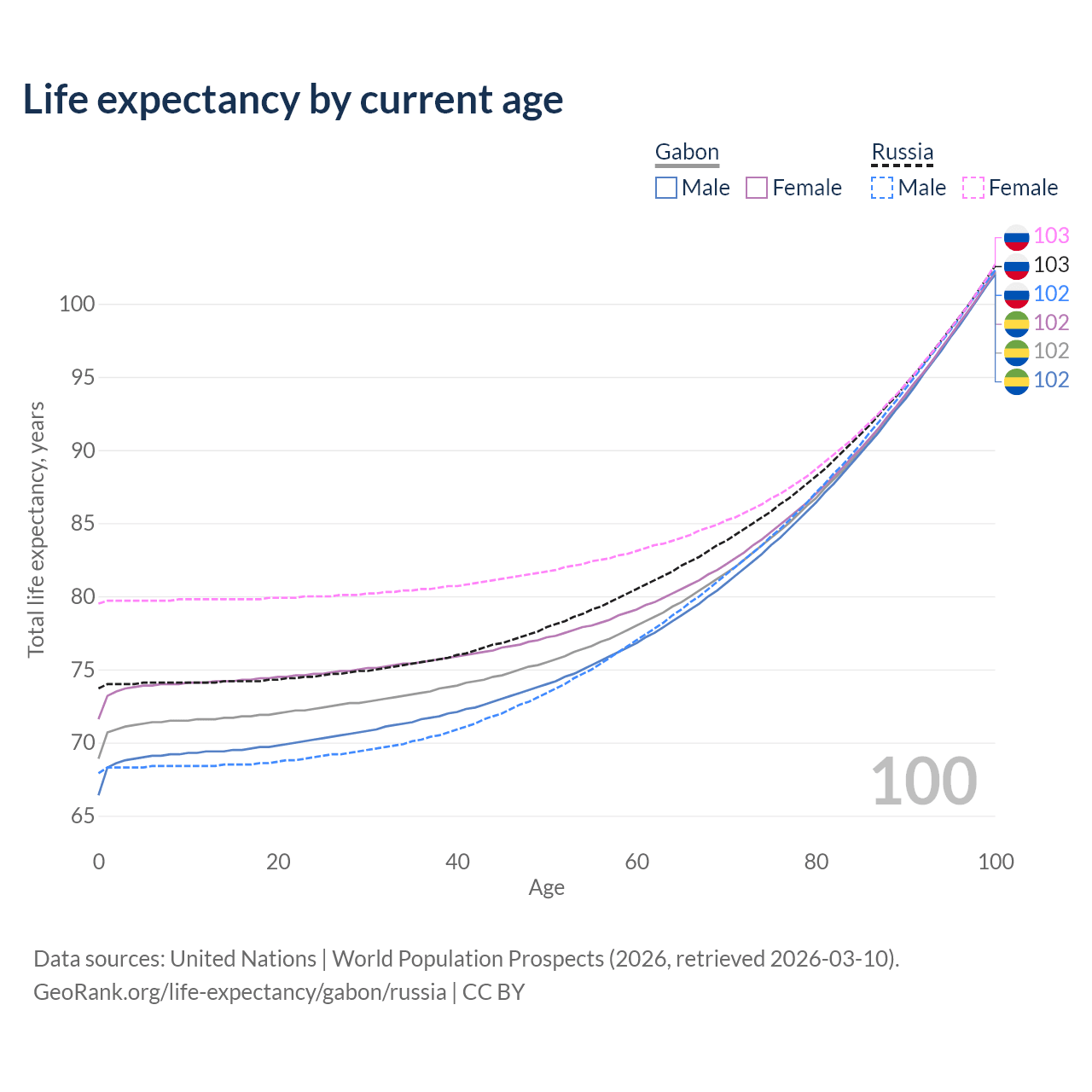 This life expectancy calculator shows the odds of living to 100, 95, 90, and below based on current age for both males and females in Gabon and Russia, along with mean and median age of death. The calculations are based on the 2026 life tables (actuarial tables) from the UN World Population Prospects.