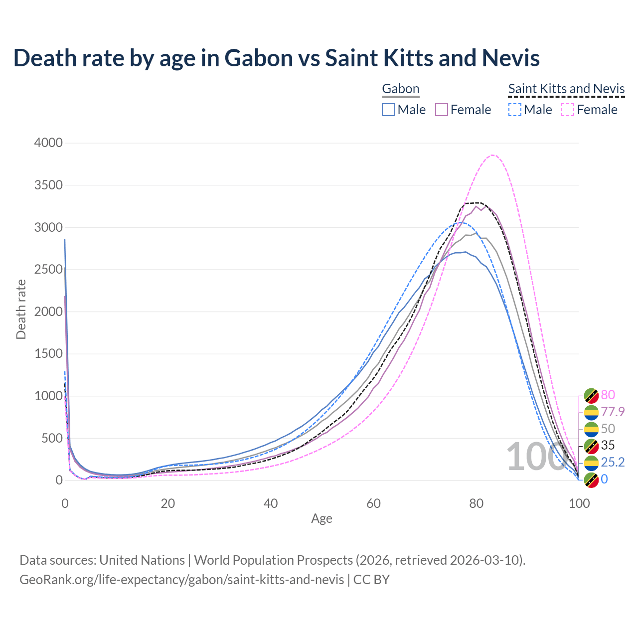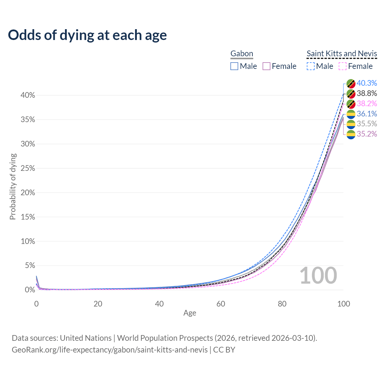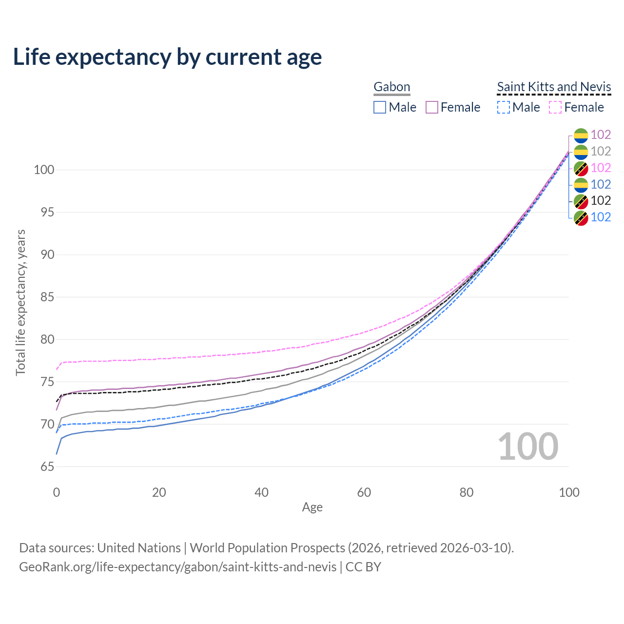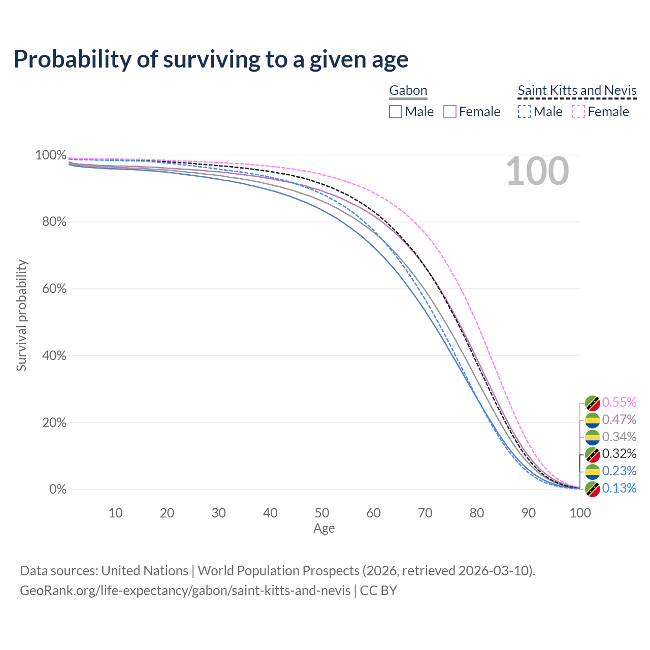 This life expectancy calculator shows the odds of living to 100, 95, 90, and below based on current age for both males and females in Gabon and Saint Kitts and Nevis, along with mean and median age of death. The calculations are based on the 2026 life tables (actuarial tables) from the UN World Population Prospects.