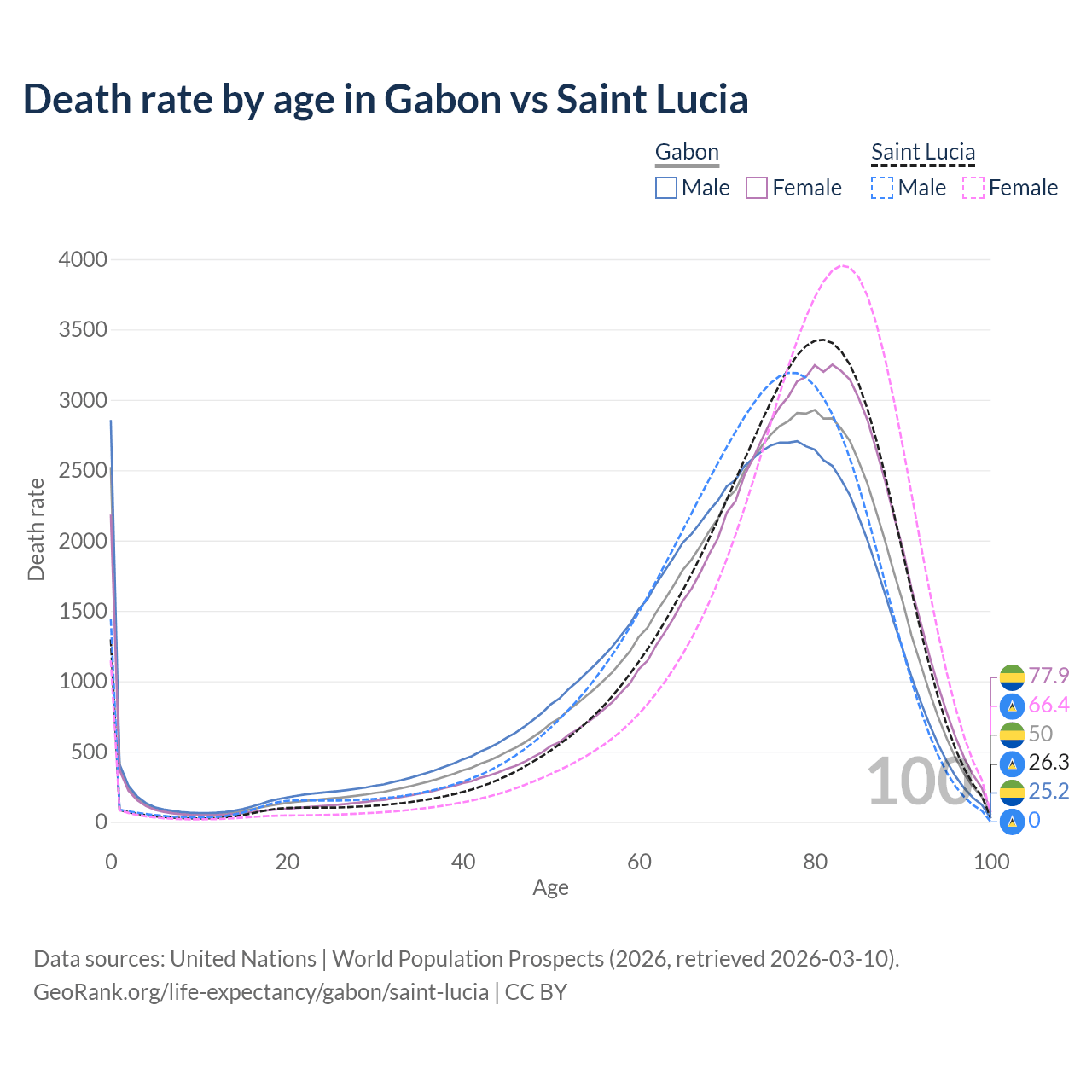 In Gabon, the most common age of death is 80, compared to 81 in Saint Lucia. The median age of death is 73.9 in Gabon and 76.8 in Saint Lucia, meaning only half of each cohort is expected to live past that age.