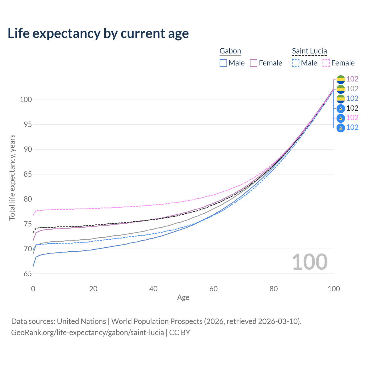This life expectancy calculator shows the odds of living to 100, 95, 90, and below based on current age for both males and females in Gabon and Saint Lucia, along with mean and median age of death. The calculations are based on the 2026 life tables (actuarial tables) from the UN World Population Prospects.