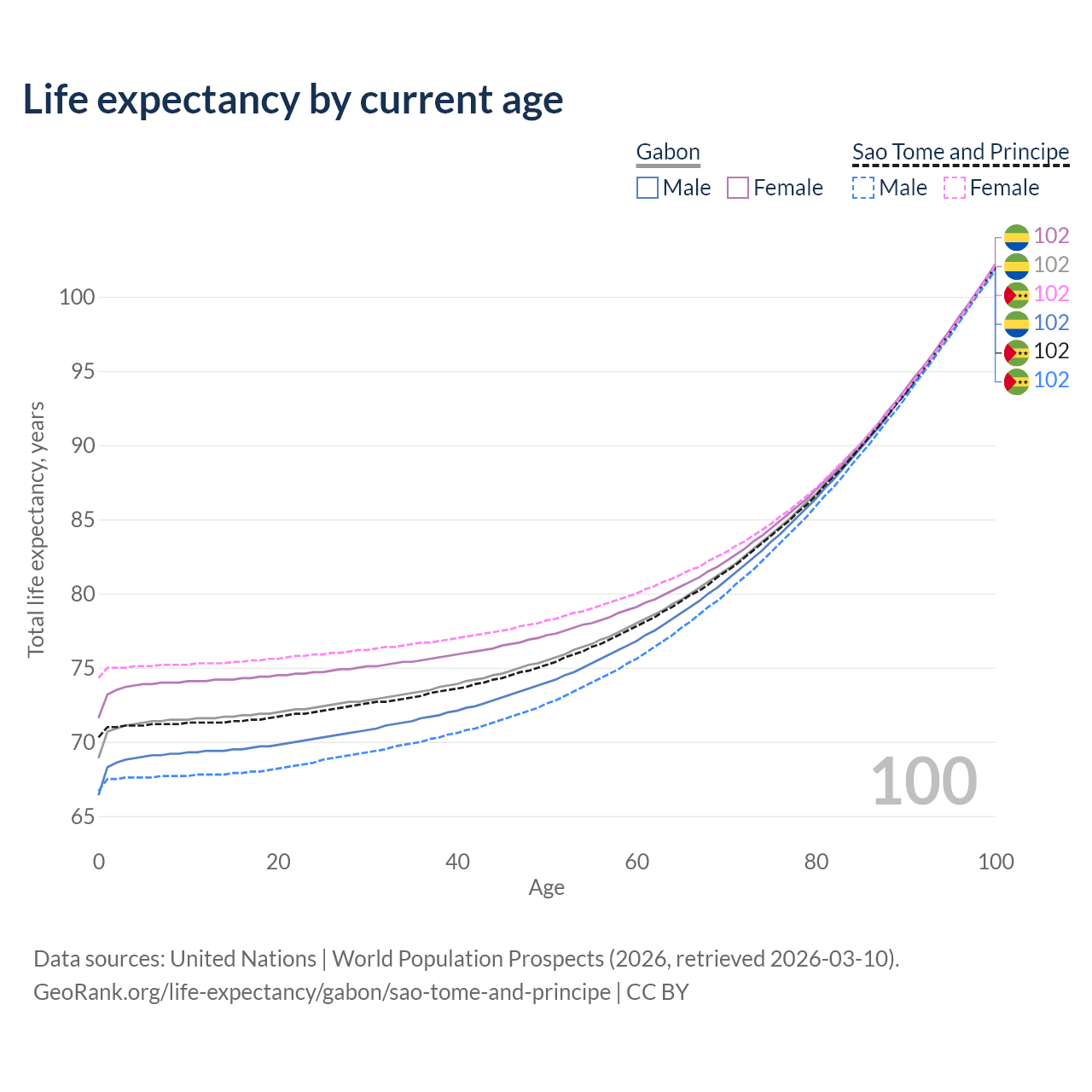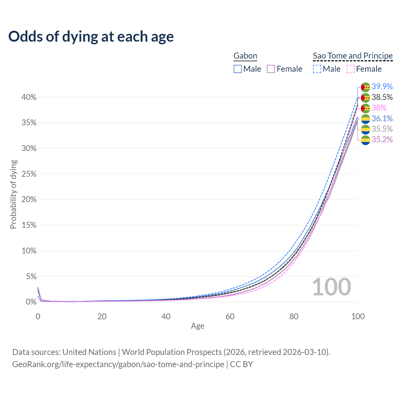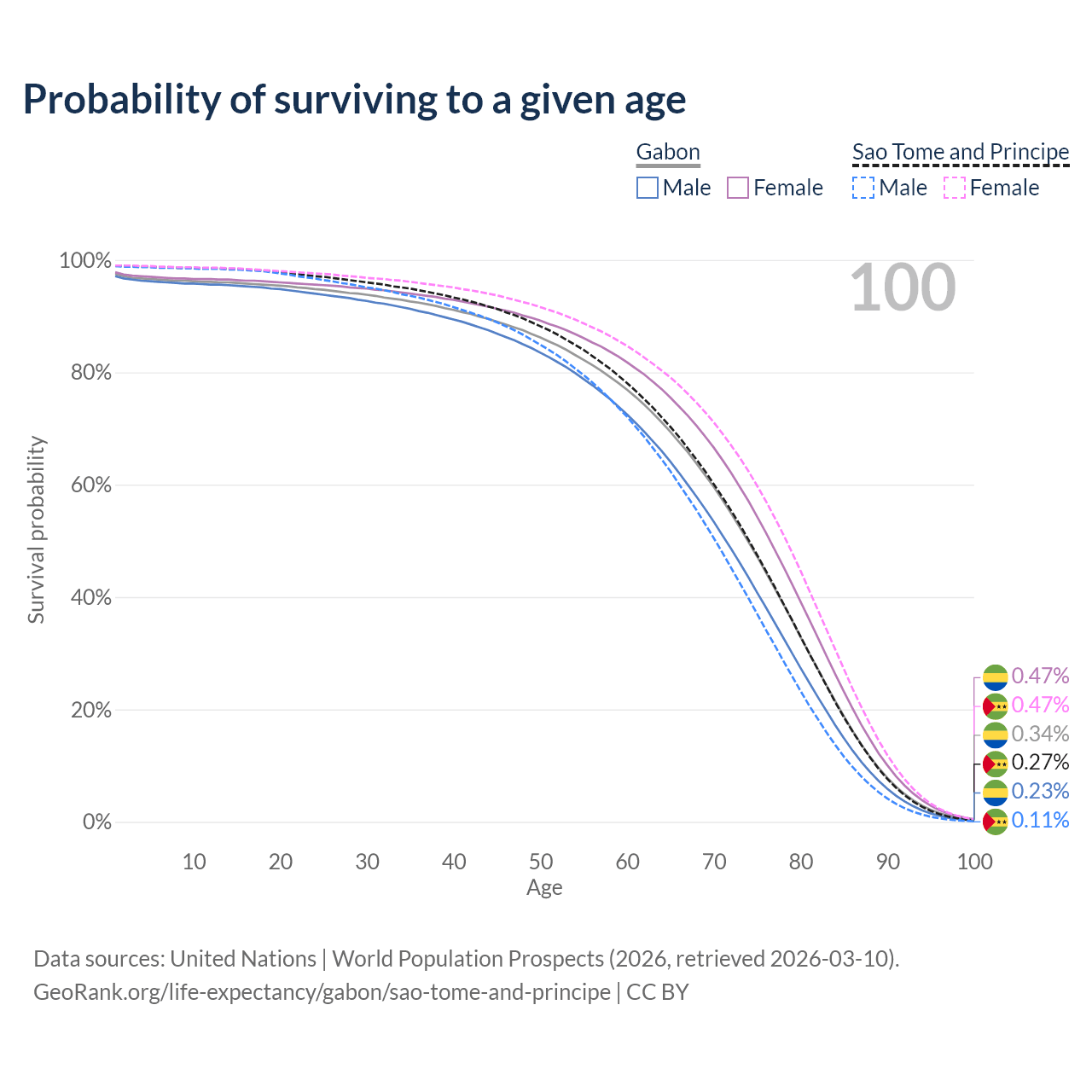 This life expectancy calculator shows the odds of living to 100, 95, 90, and below based on current age for both males and females in Gabon and Sao Tome and Principe, along with mean and median age of death. The calculations are based on the 2026 life tables (actuarial tables) from the UN World Population Prospects.