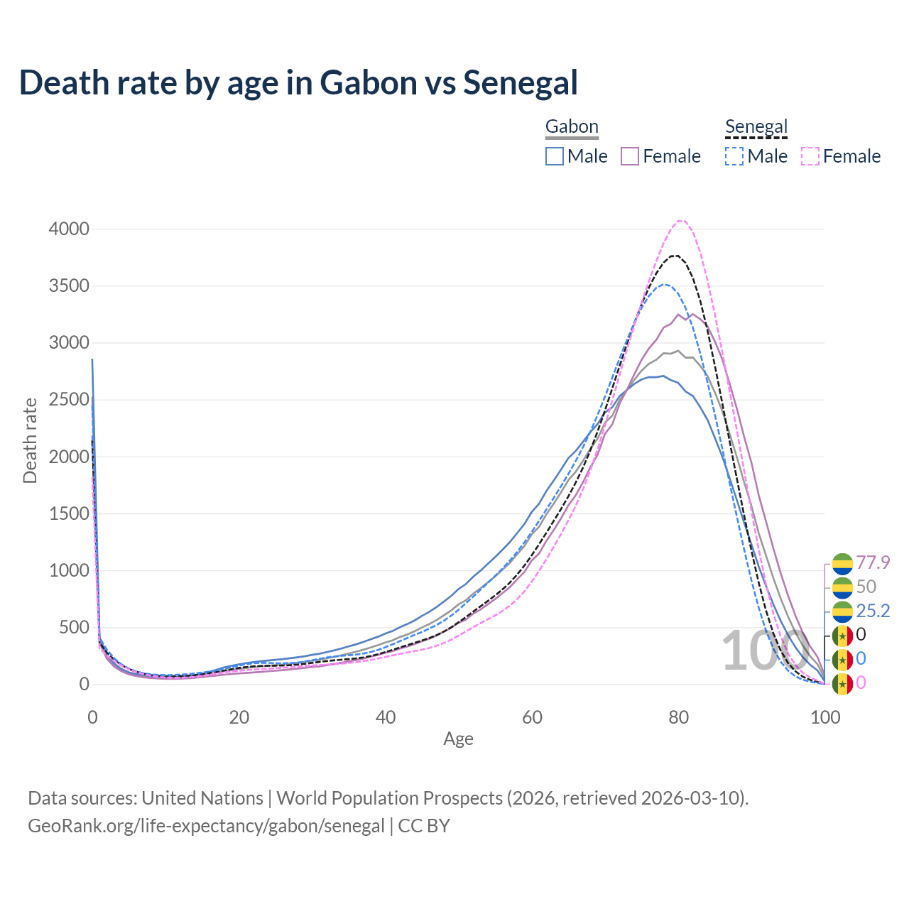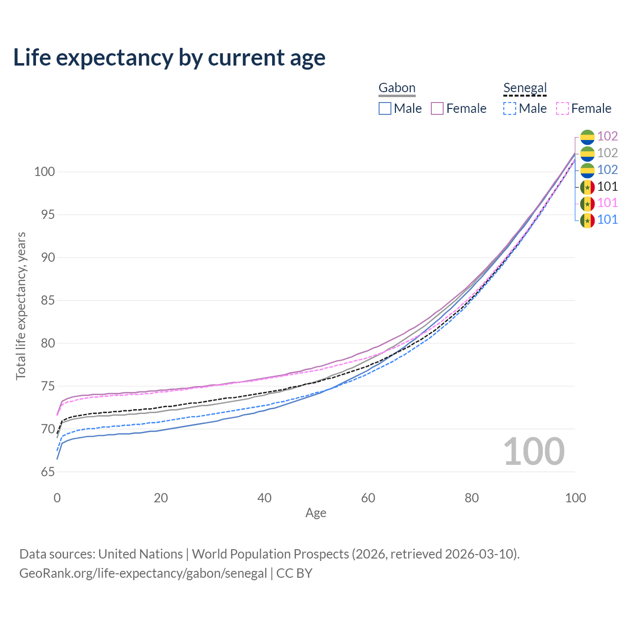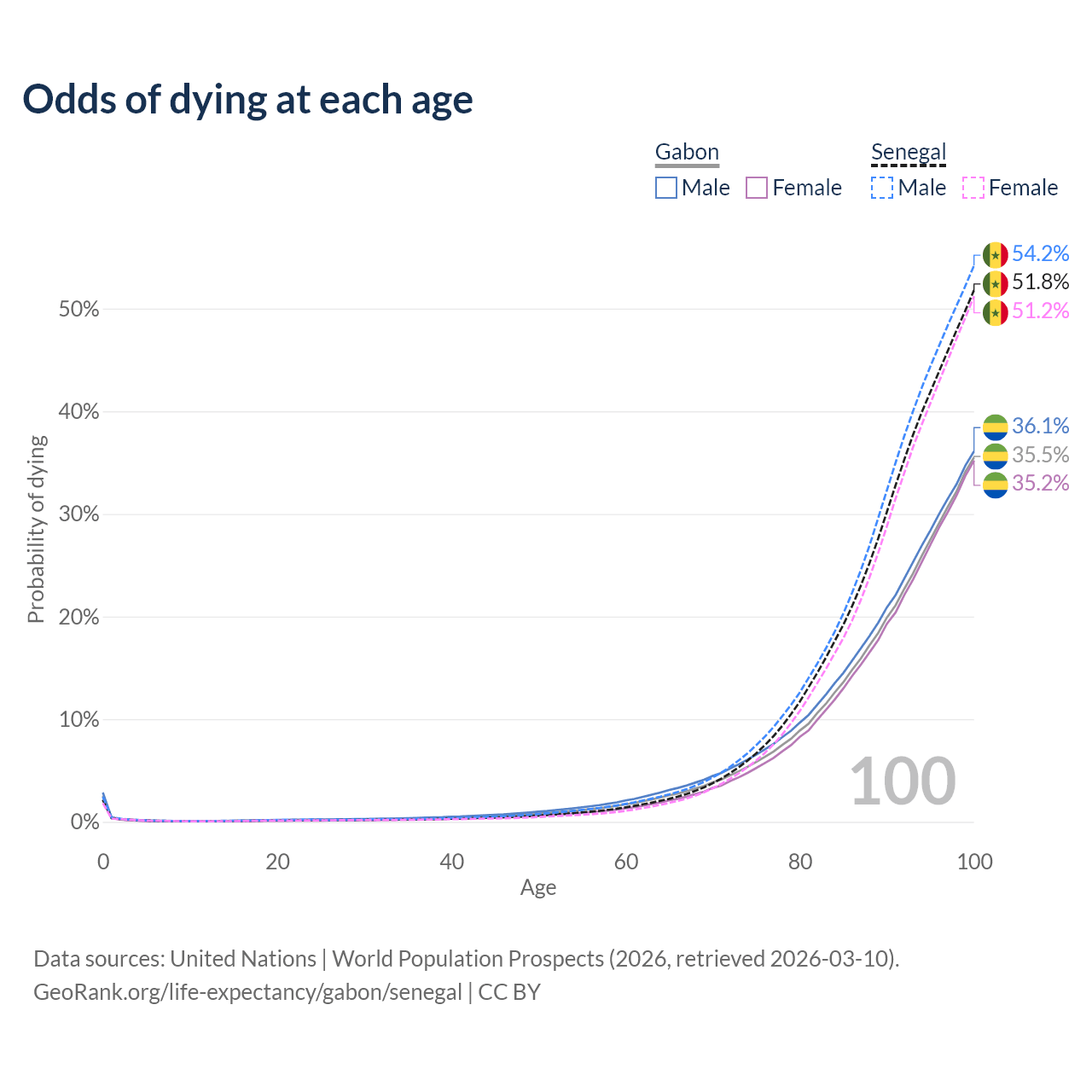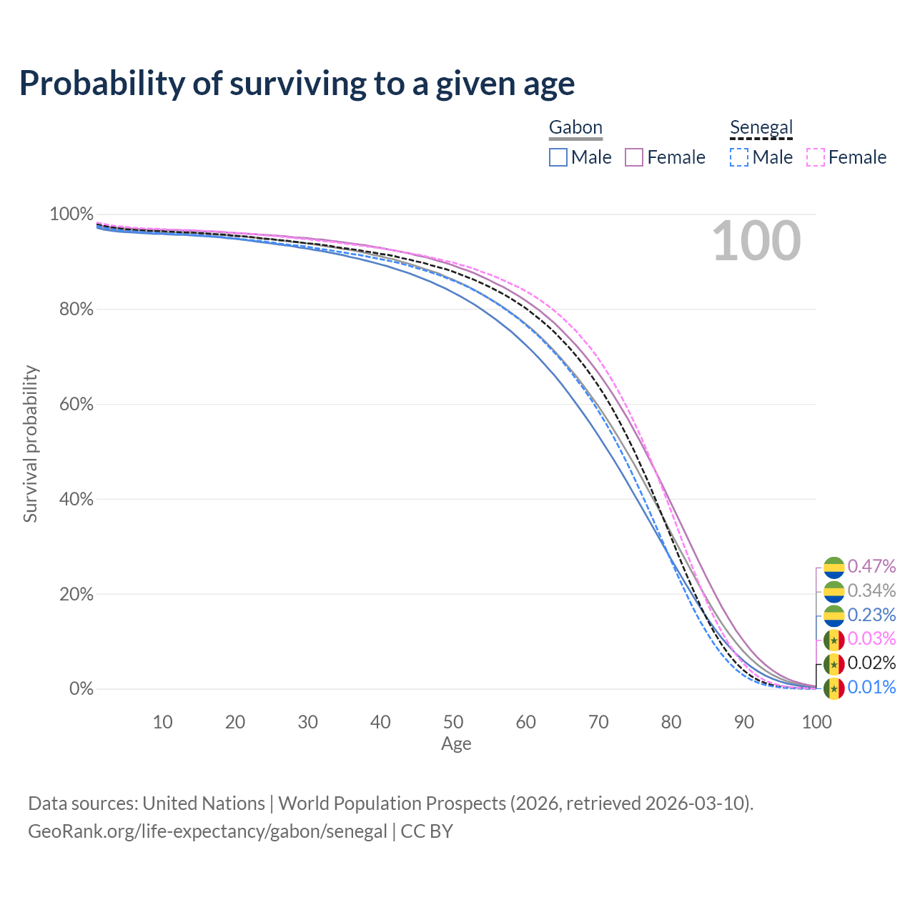 This life expectancy calculator shows the odds of living to 100, 95, 90, and below based on current age for both males and females in Gabon and Senegal, along with mean and median age of death. The calculations are based on the 2026 life tables (actuarial tables) from the UN World Population Prospects.