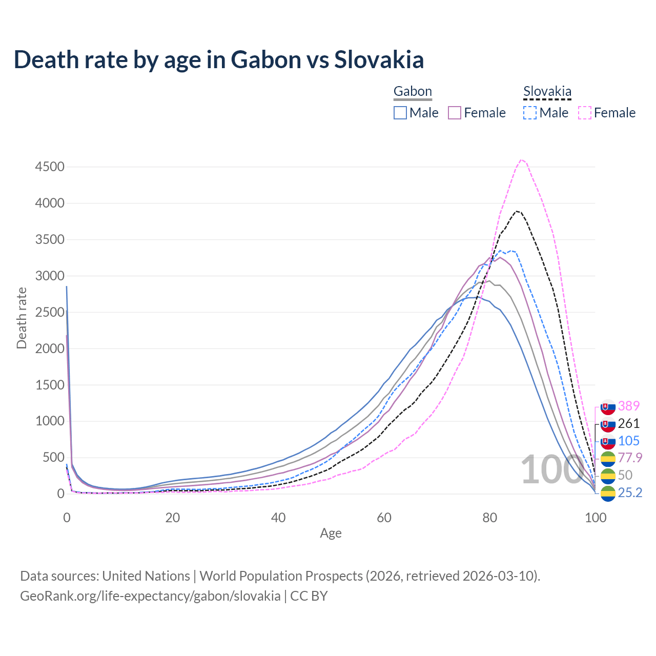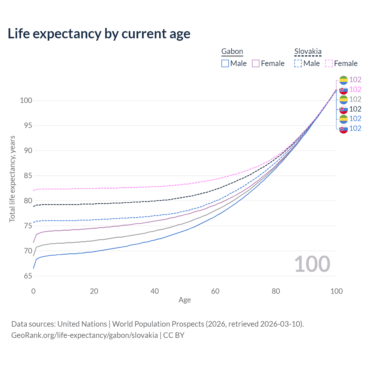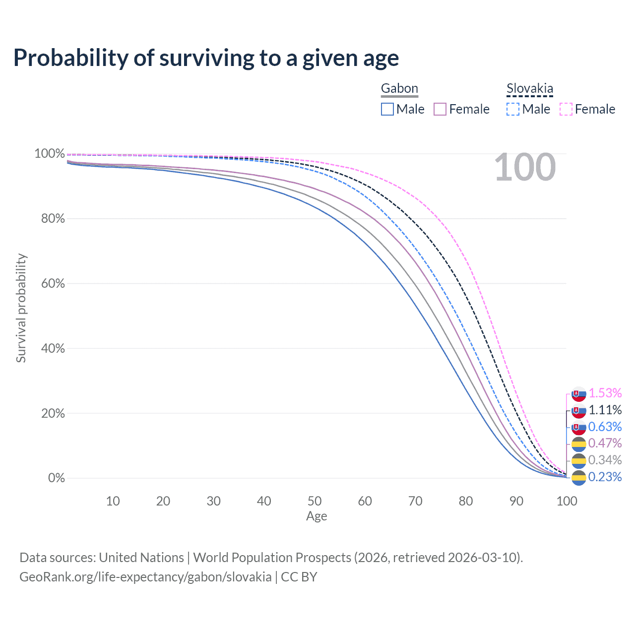 This life expectancy calculator shows the odds of living to 100, 95, 90, and below based on current age for both males and females in Gabon and Slovakia, along with mean and median age of death. The calculations are based on the 2026 life tables (actuarial tables) from the UN World Population Prospects.