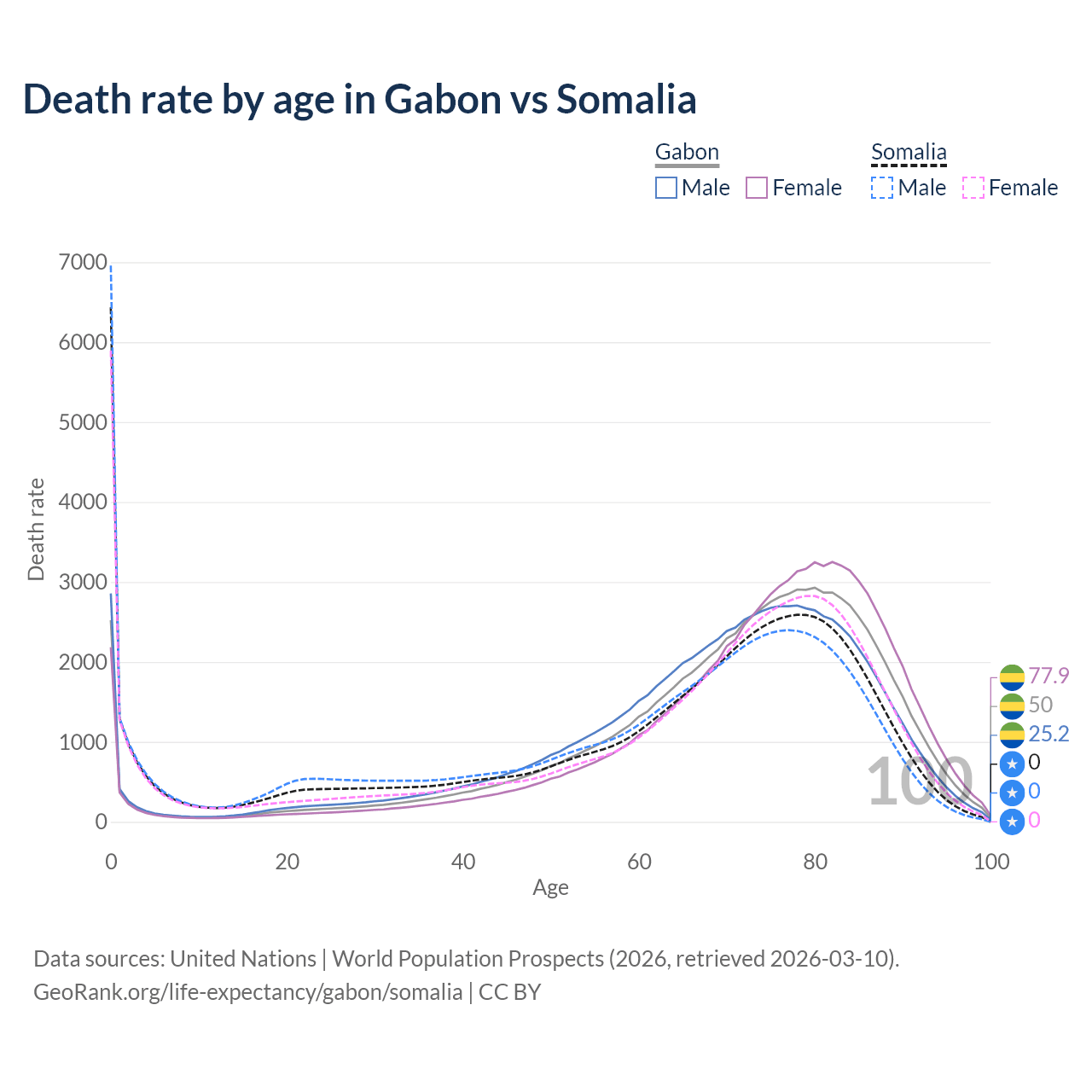 In Gabon, the most common age of death is 80, compared to 0 in Somalia. The median age of death is 73.9 in Gabon and 69 in Somalia, meaning only half of each cohort is expected to live past that age.