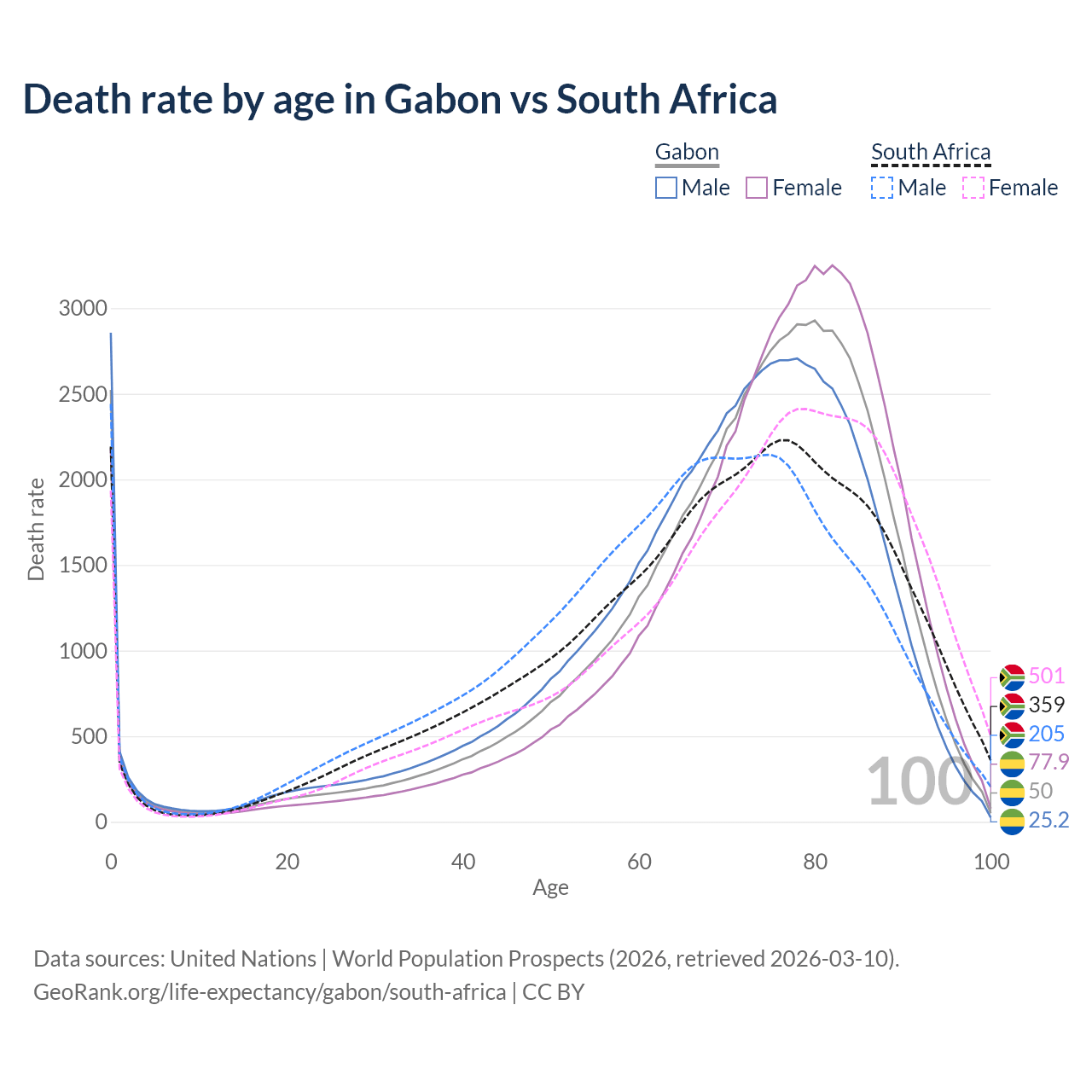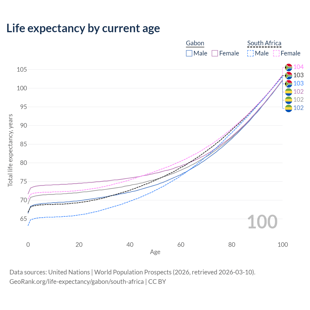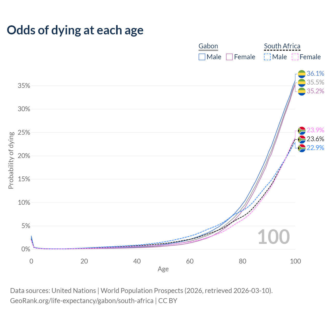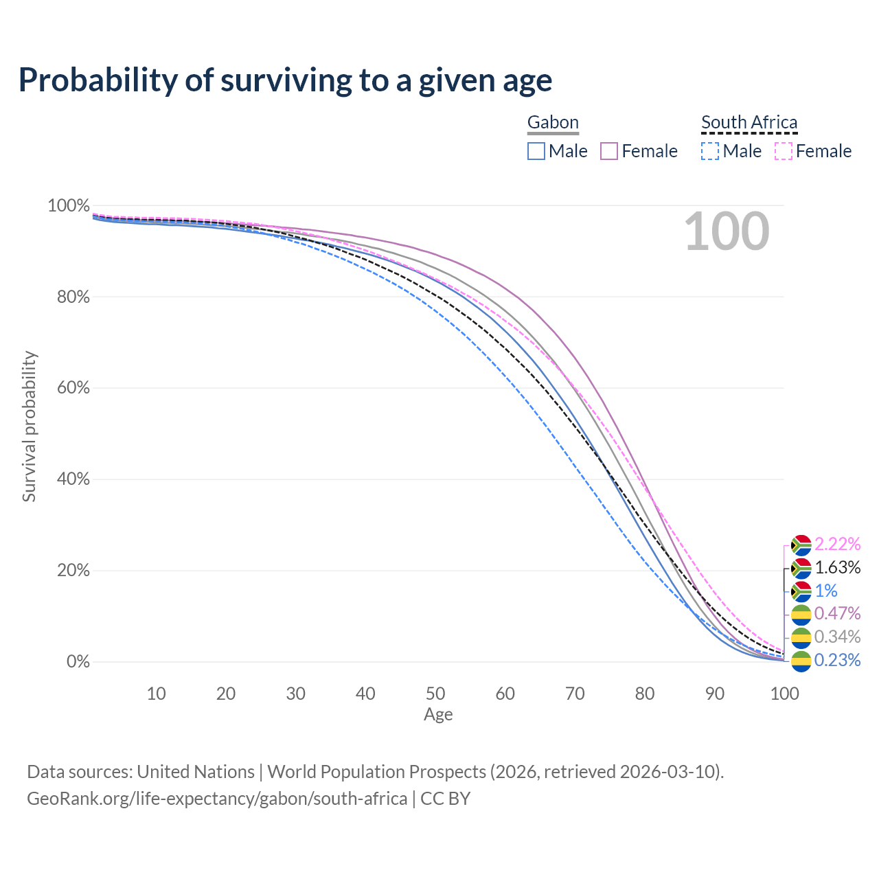 This life expectancy calculator shows the odds of living to 100, 95, 90, and below based on current age for both males and females in Gabon and South Africa, along with mean and median age of death. The calculations are based on the 2026 life tables (actuarial tables) from the UN World Population Prospects.
