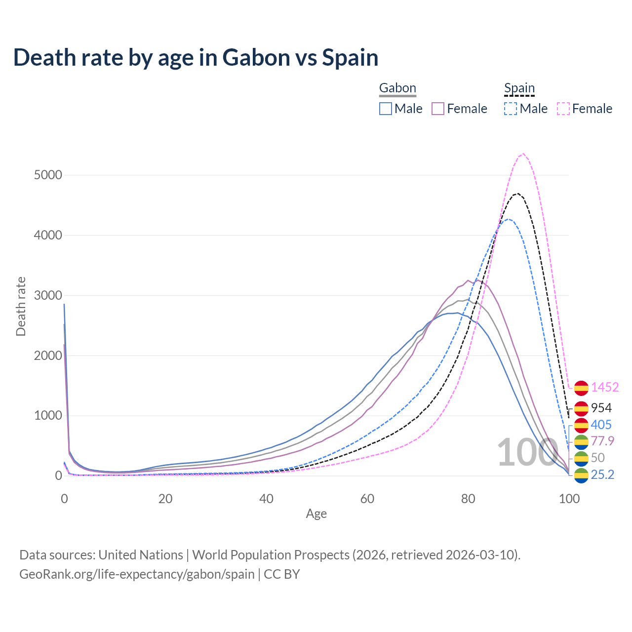 In Gabon, the most common age of death is 80, compared to 90 in Spain. The median age of death is 73.9 in Gabon and 87 in Spain, meaning only half of each cohort is expected to live past that age.