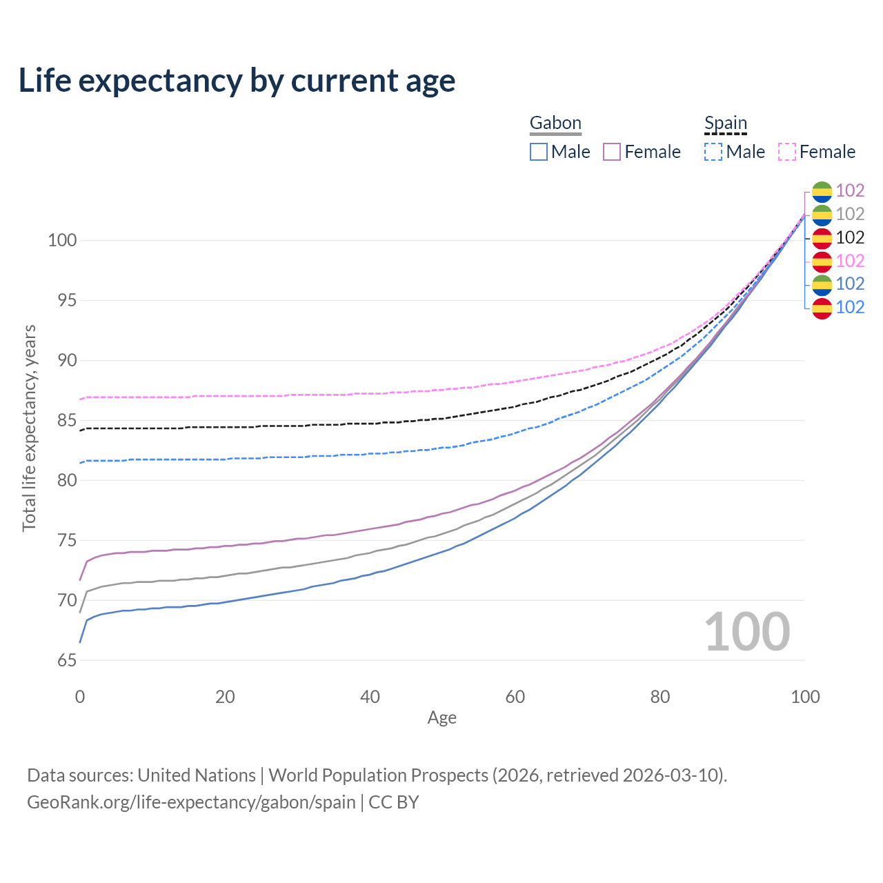 This life expectancy calculator shows the odds of living to 100, 95, 90, and below based on current age for both males and females in Gabon and Spain, along with mean and median age of death. The calculations are based on the 2026 life tables (actuarial tables) from the UN World Population Prospects.