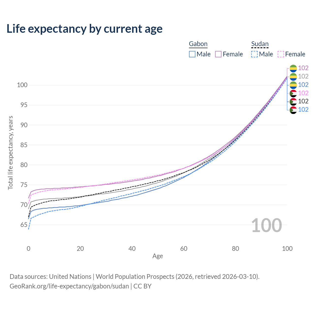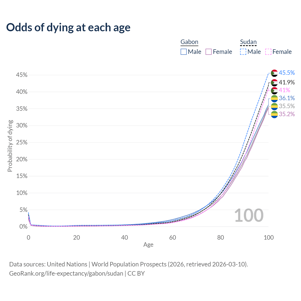 This life expectancy calculator shows the odds of living to 100, 95, 90, and below based on current age for both males and females in Gabon and Sudan, along with mean and median age of death. The calculations are based on the 2026 life tables (actuarial tables) from the UN World Population Prospects.
