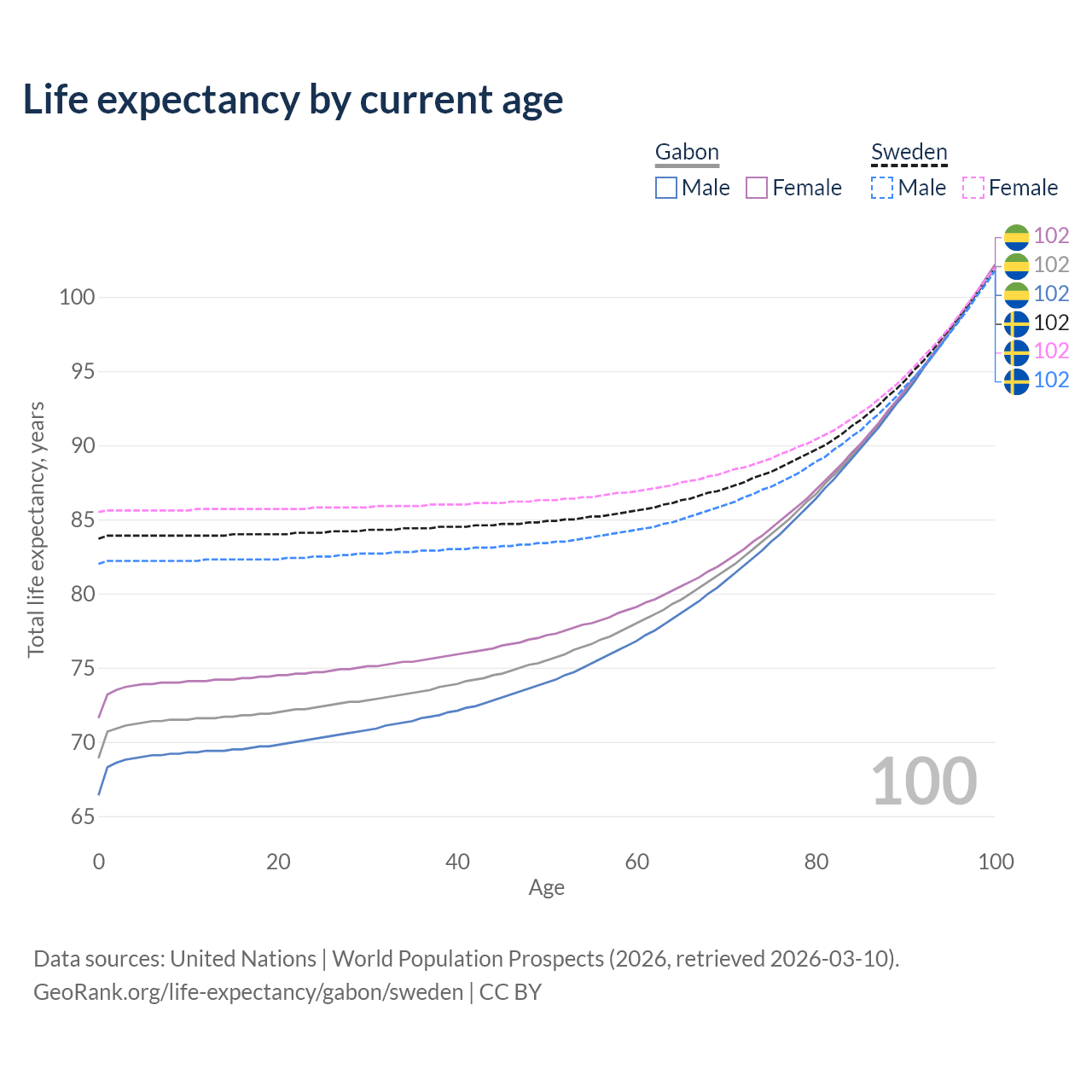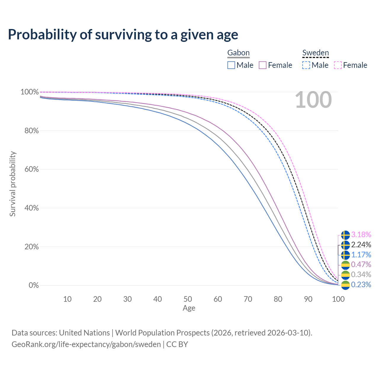This life expectancy calculator shows the odds of living to 100, 95, 90, and below based on current age for both males and females in Gabon and Sweden, along with mean and median age of death. The calculations are based on the 2026 life tables (actuarial tables) from the UN World Population Prospects.