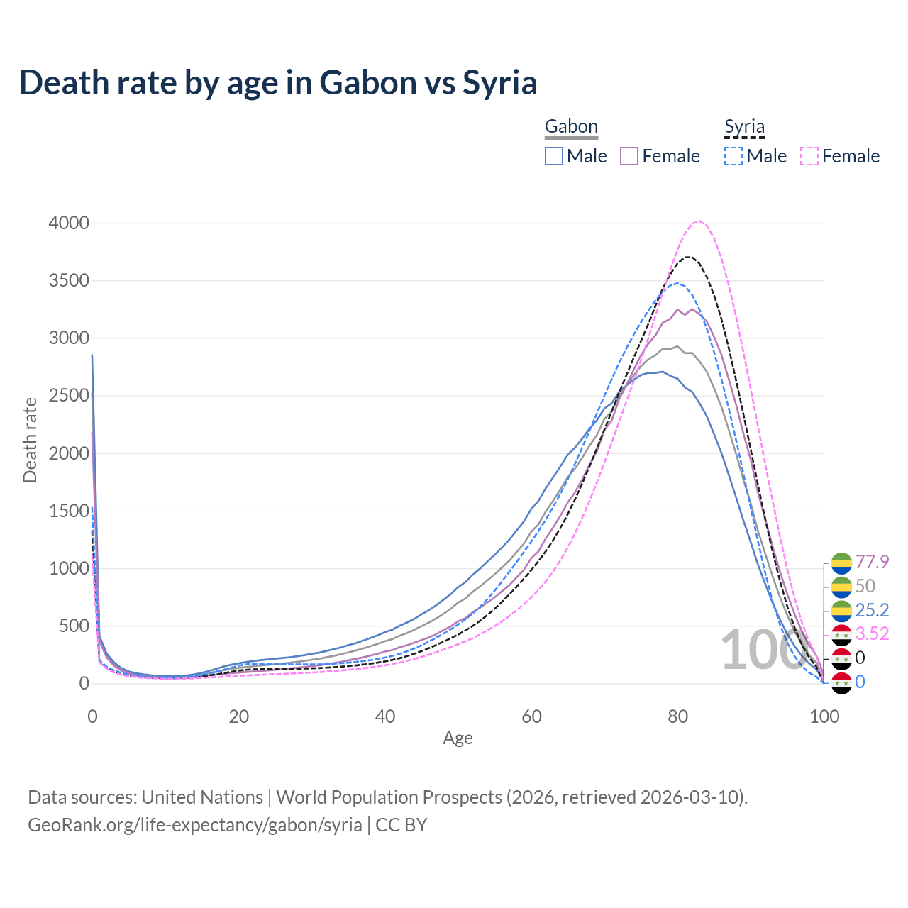 In Gabon, the most common age of death is 80, compared to 82 in Syria. The median age of death is 73.9 in Gabon and 77.7 in Syria, meaning only half of each cohort is expected to live past that age.