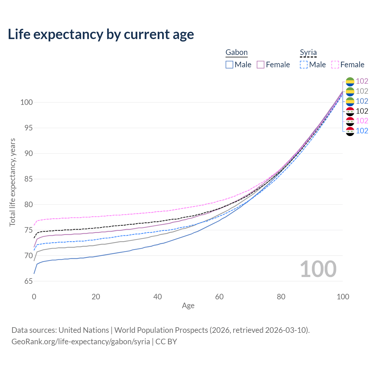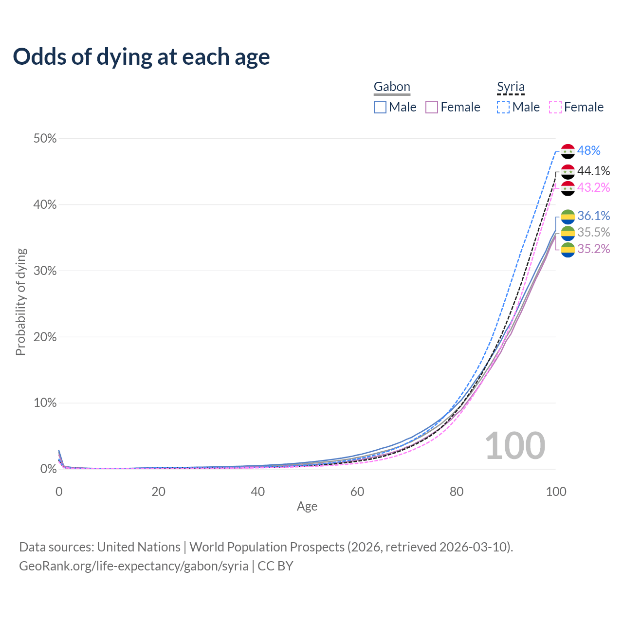 This life expectancy calculator shows the odds of living to 100, 95, 90, and below based on current age for both males and females in Gabon and Syria, along with mean and median age of death. The calculations are based on the 2026 life tables (actuarial tables) from the UN World Population Prospects.
