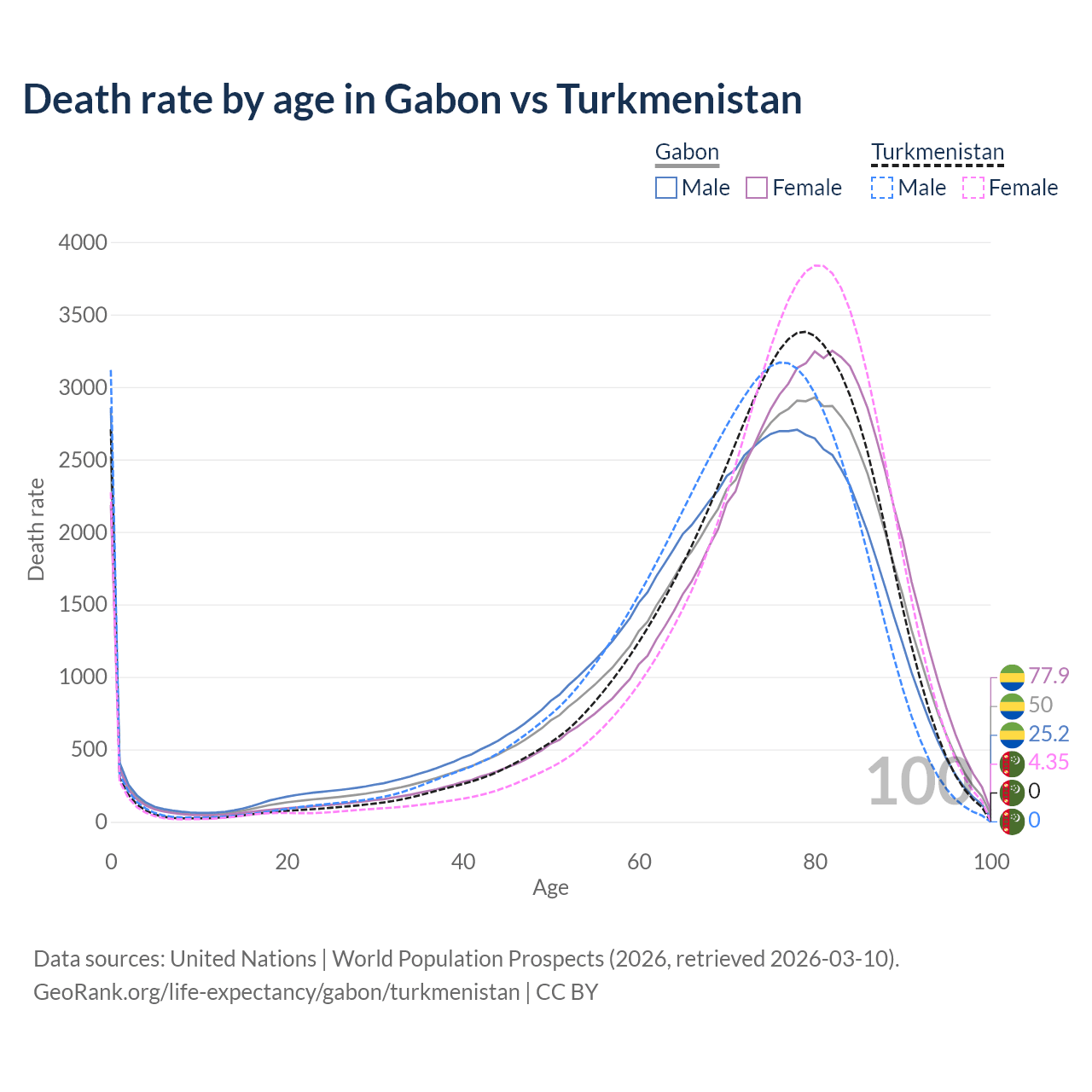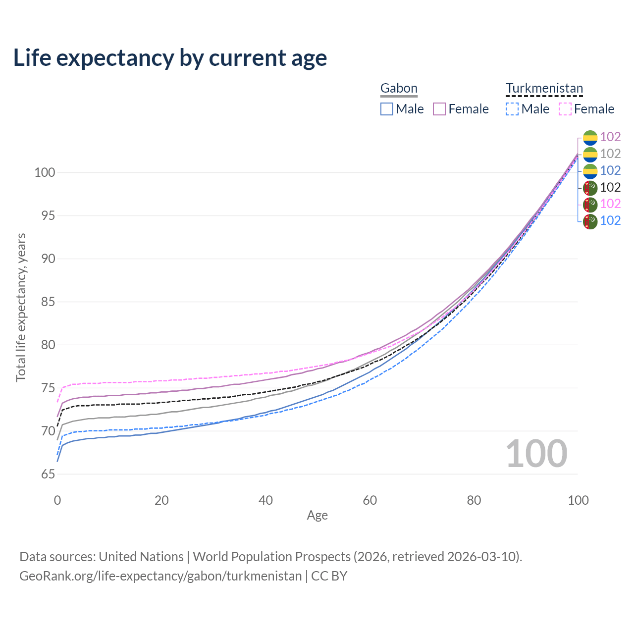 This life expectancy calculator shows the odds of living to 100, 95, 90, and below based on current age for both males and females in Gabon and Turkmenistan, along with mean and median age of death. The calculations are based on the 2026 life tables (actuarial tables) from the UN World Population Prospects.