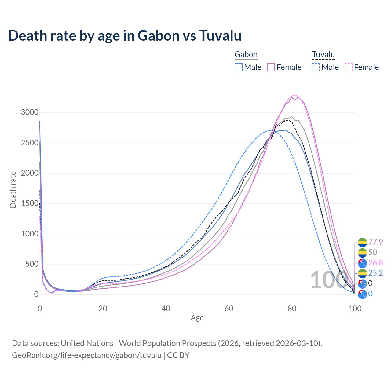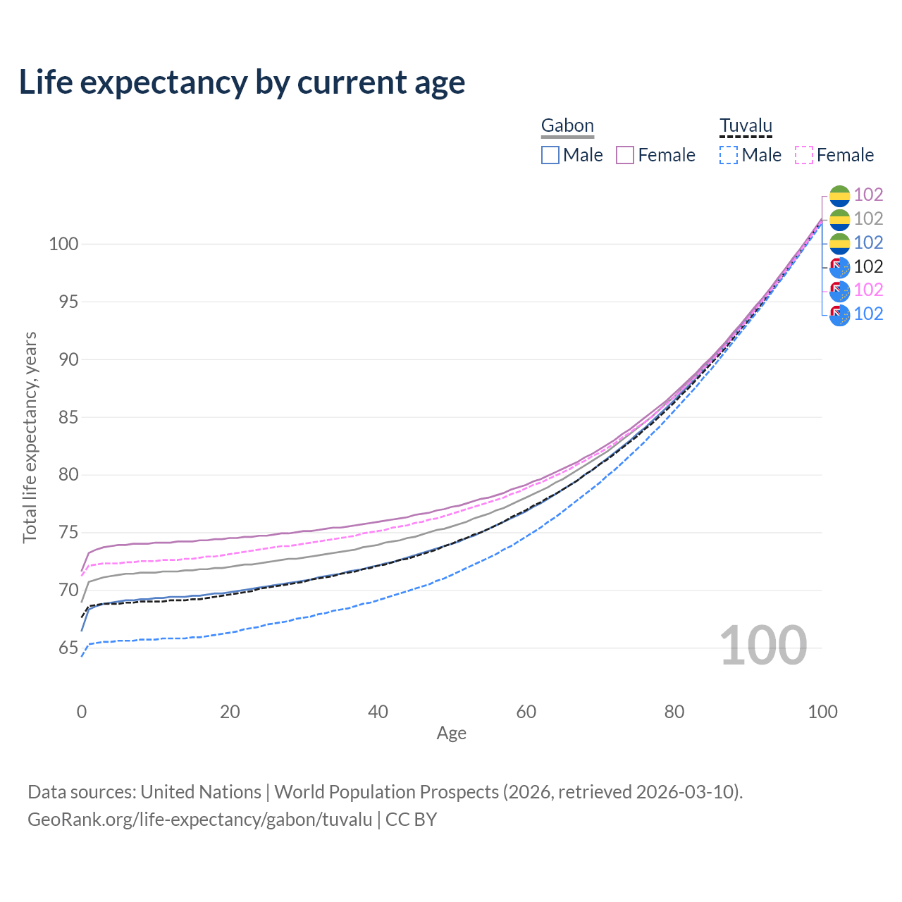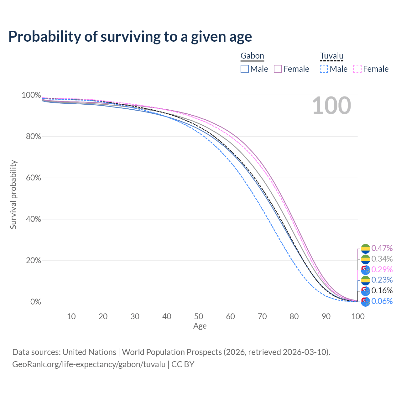 This life expectancy calculator shows the odds of living to 100, 95, 90, and below based on current age for both males and females in Gabon and Tuvalu, along with mean and median age of death. The calculations are based on the 2026 life tables (actuarial tables) from the UN World Population Prospects.