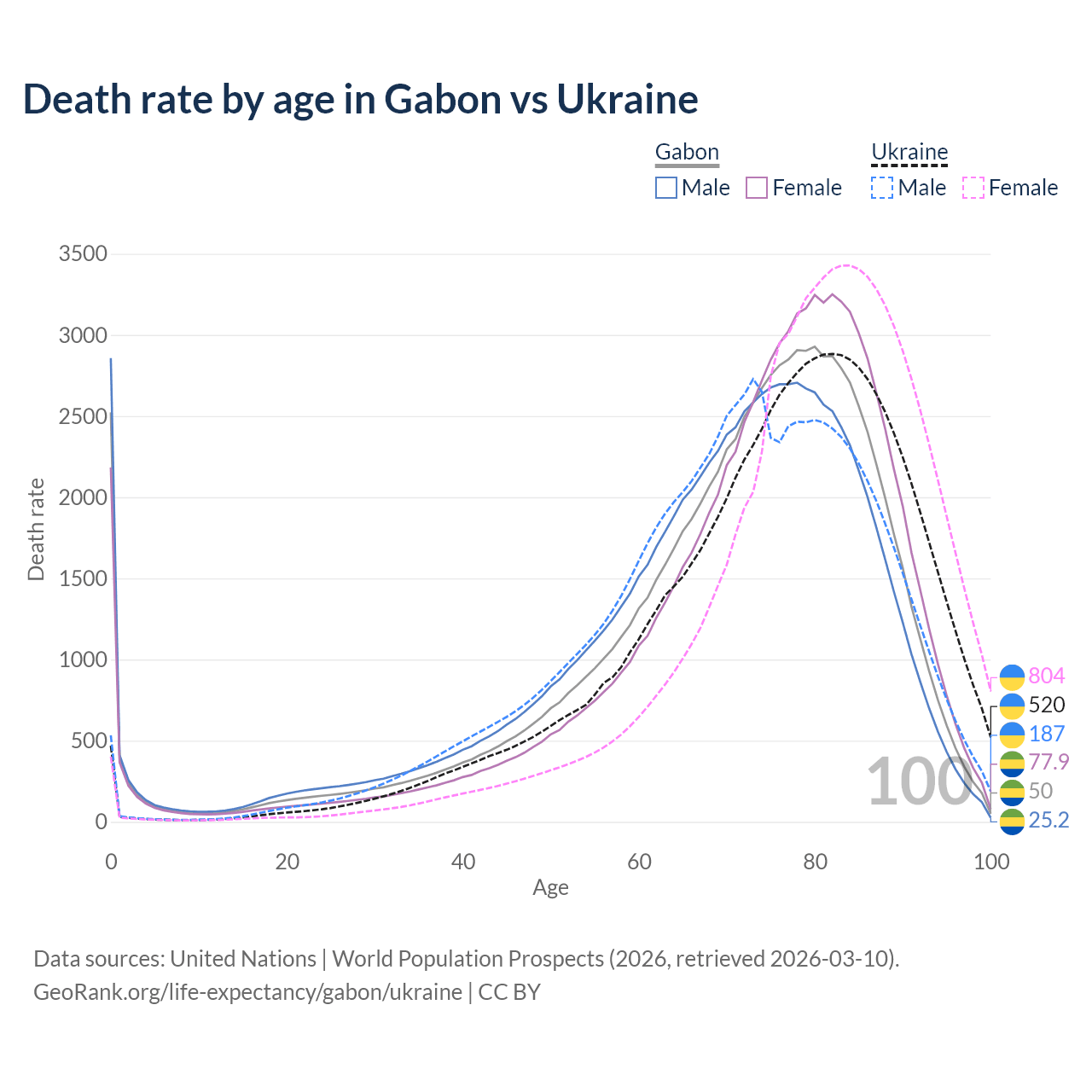 In Gabon, the most common age of death is 80, compared to 82 in Ukraine. The median age of death is 73.9 in Gabon and 78 in Ukraine, meaning only half of each cohort is expected to live past that age.