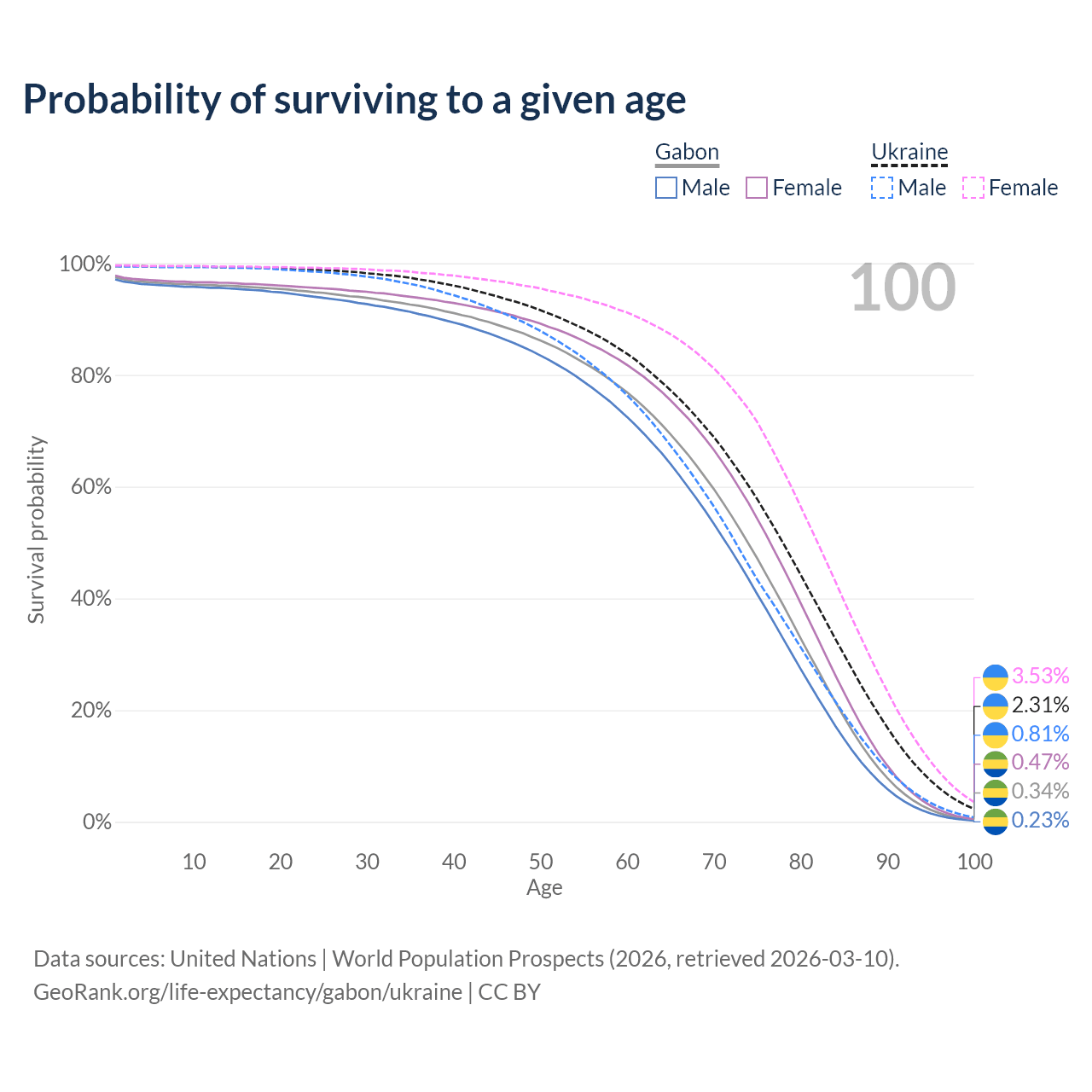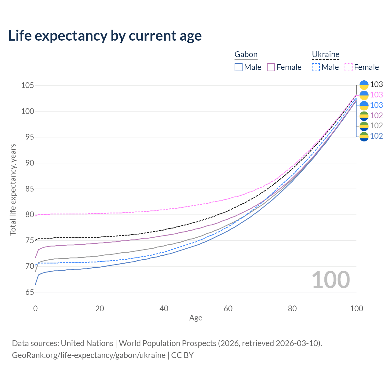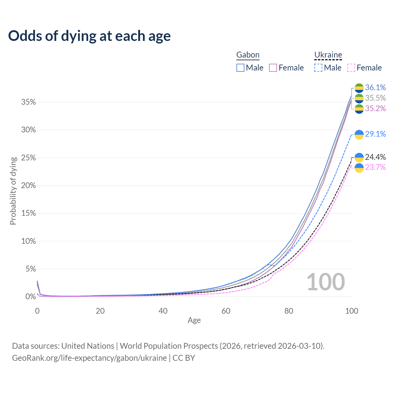 This life expectancy calculator shows the odds of living to 100, 95, 90, and below based on current age for both males and females in Gabon and Ukraine, along with mean and median age of death. The calculations are based on the 2026 life tables (actuarial tables) from the UN World Population Prospects.