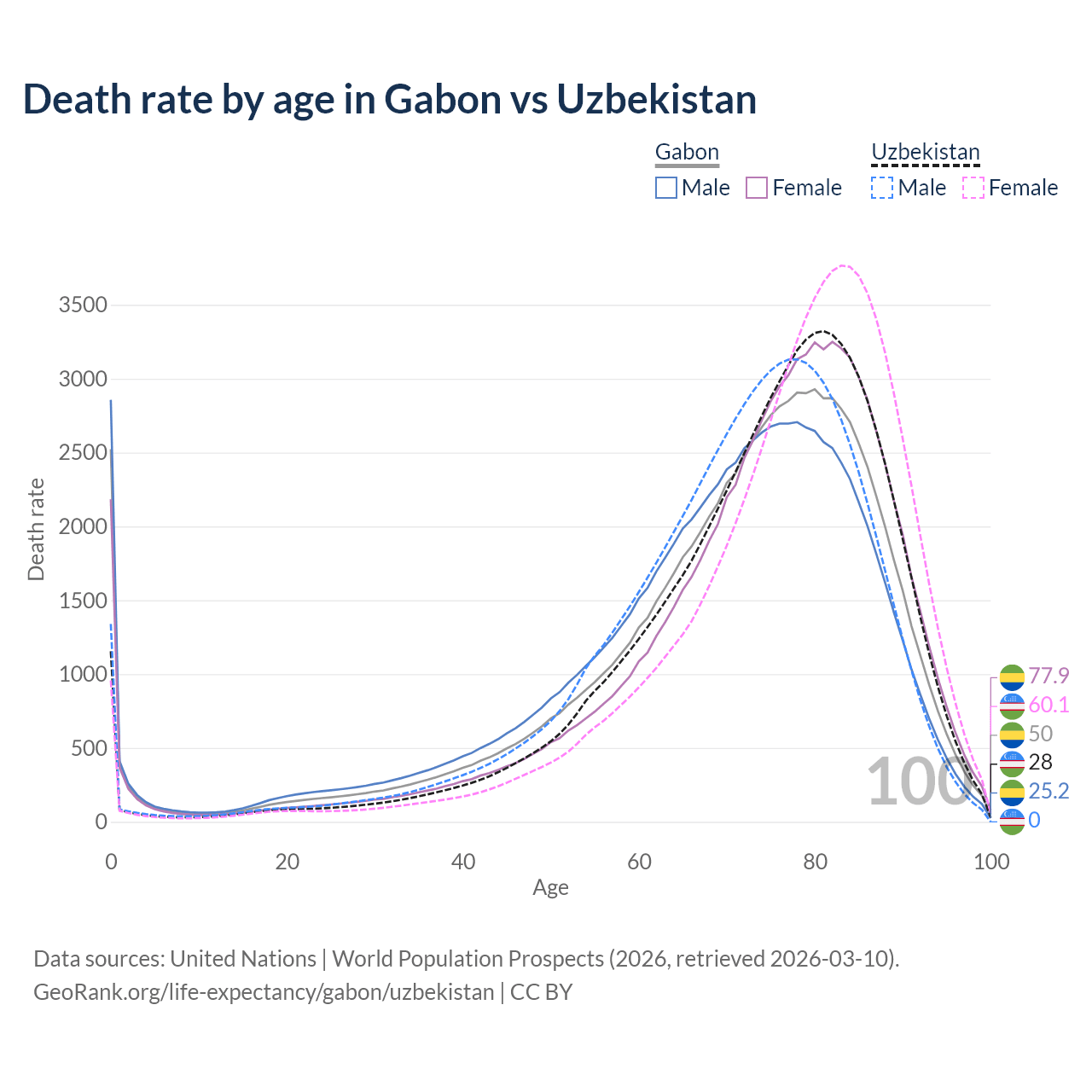 In Gabon, the most common age of death is 80, compared to 81 in Uzbekistan. The median age of death is 73.9 in Gabon and 76.4 in Uzbekistan, meaning only half of each cohort is expected to live past that age.