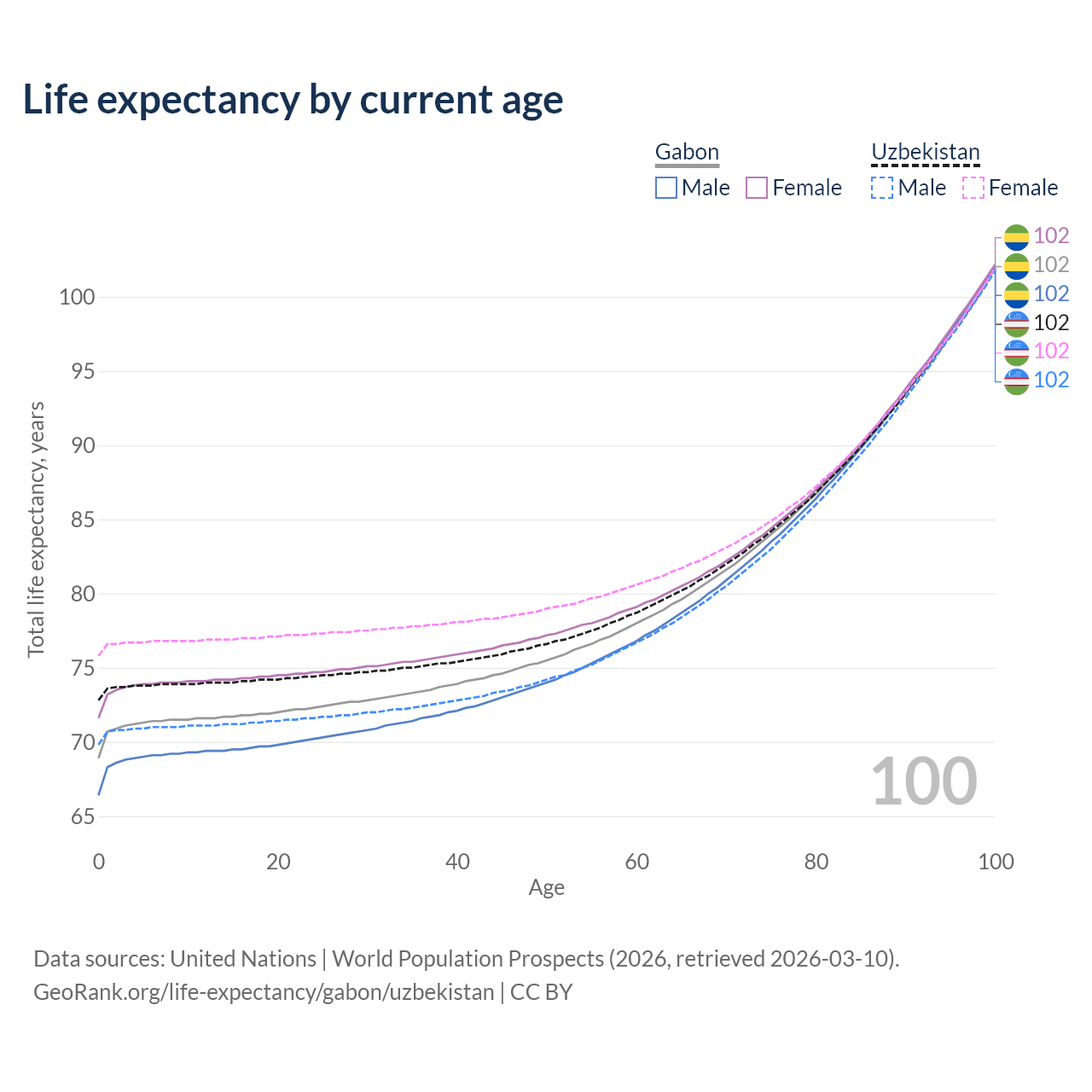This life expectancy calculator shows the odds of living to 100, 95, 90, and below based on current age for both males and females in Gabon and Uzbekistan, along with mean and median age of death. The calculations are based on the 2026 life tables (actuarial tables) from the UN World Population Prospects.