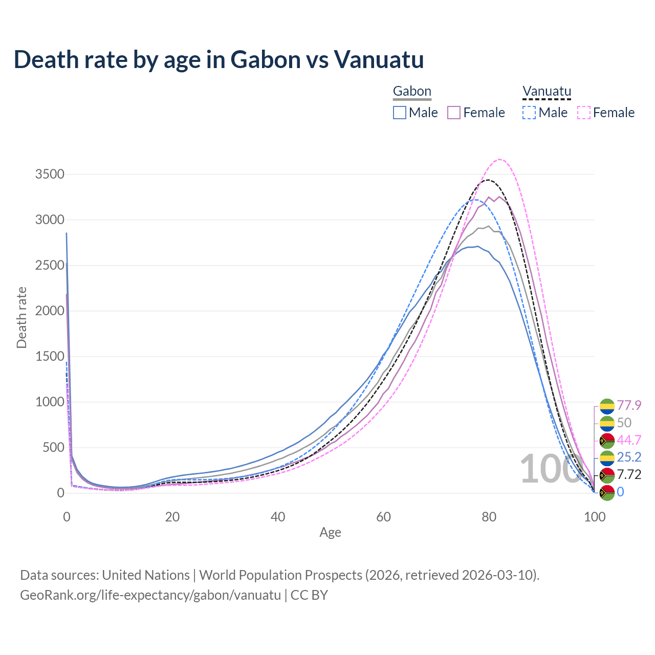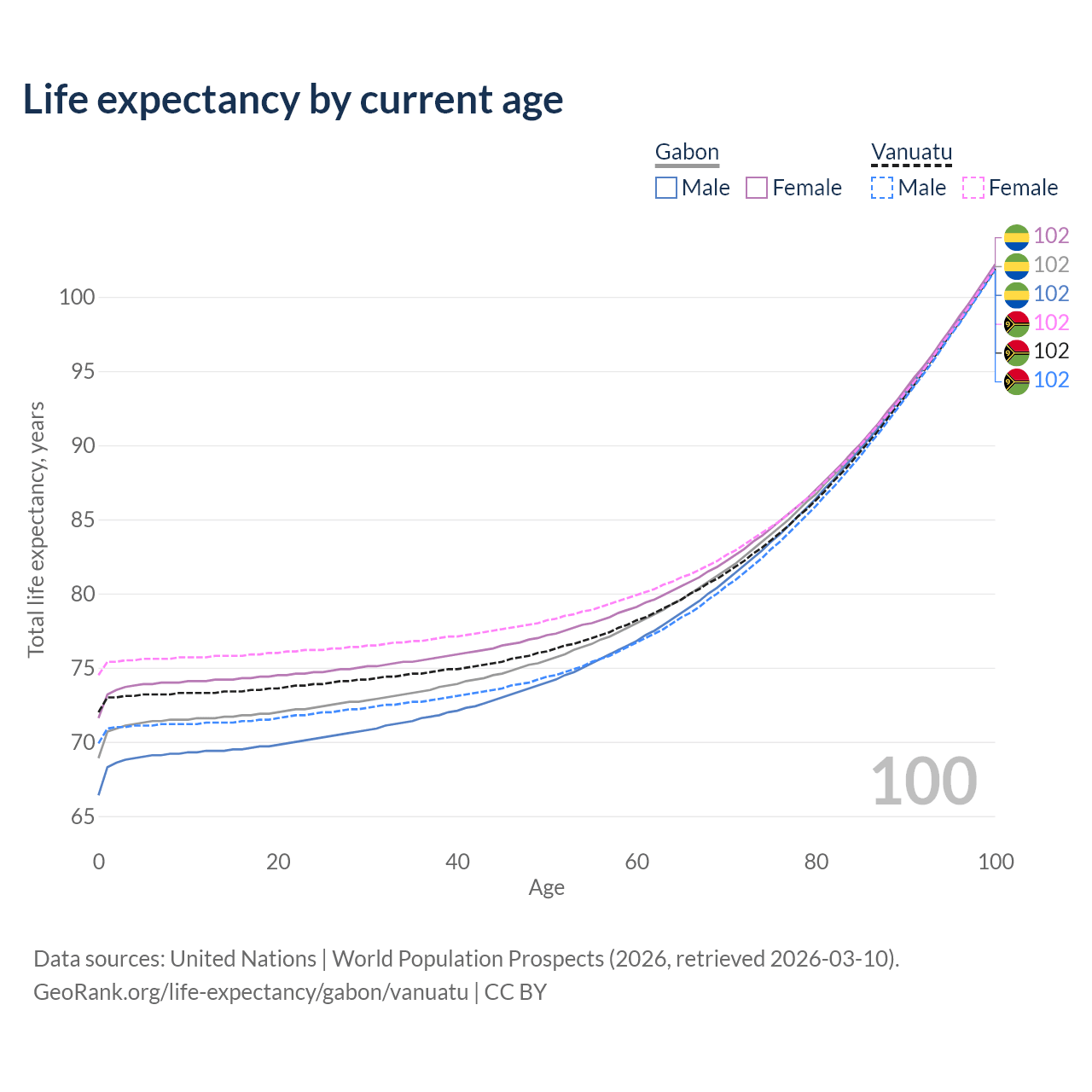 This life expectancy calculator shows the odds of living to 100, 95, 90, and below based on current age for both males and females in Gabon and Vanuatu, along with mean and median age of death. The calculations are based on the 2026 life tables (actuarial tables) from the UN World Population Prospects.