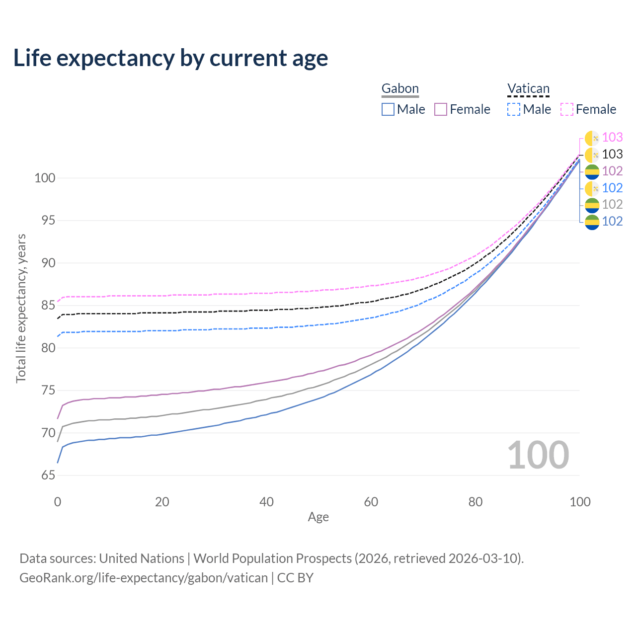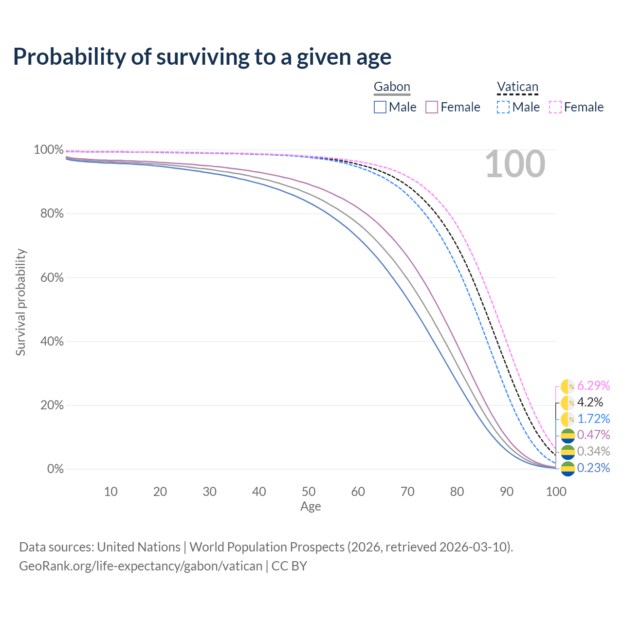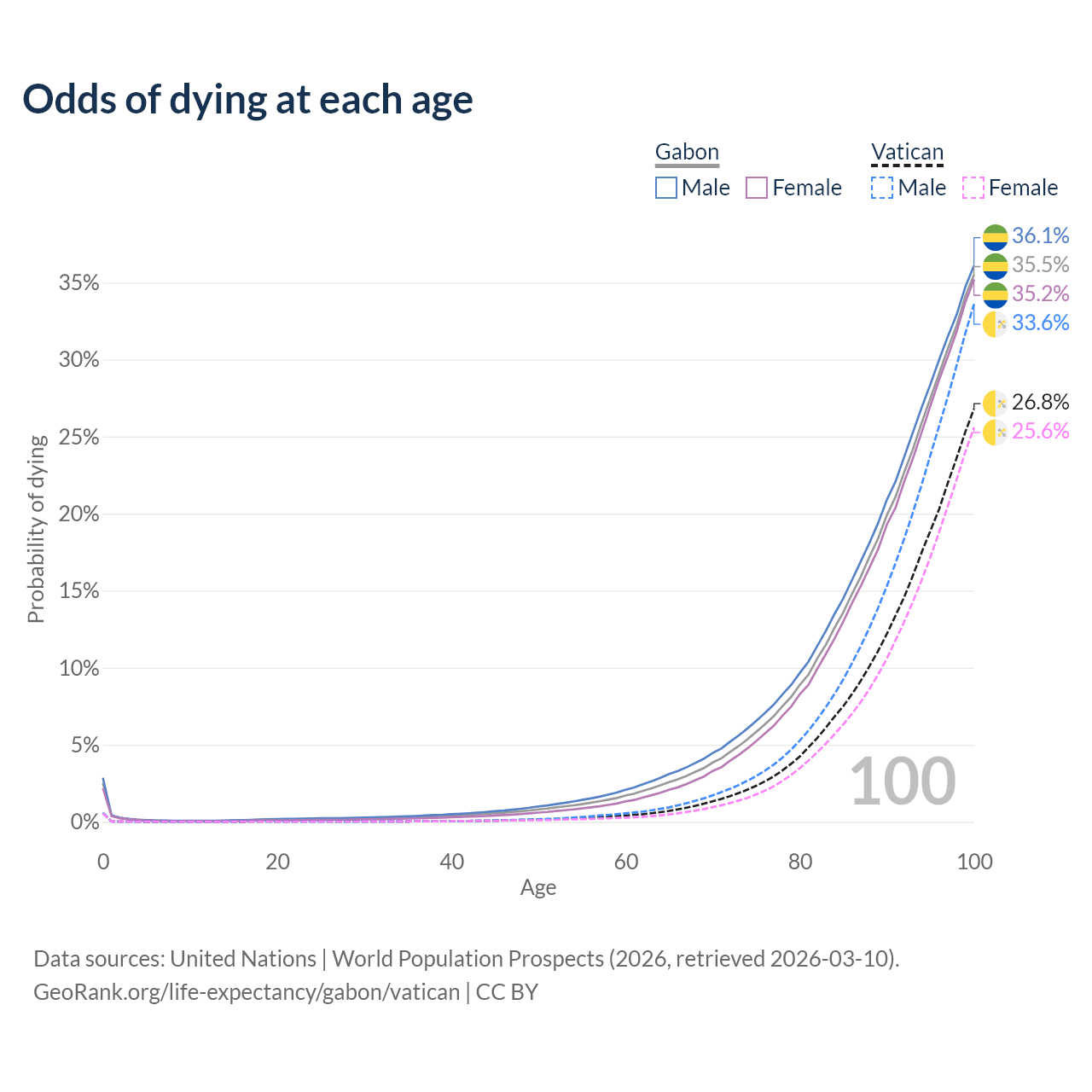 This life expectancy calculator shows the odds of living to 100, 95, 90, and below based on current age for both males and females in Gabon and the Vatican, along with mean and median age of death. The calculations are based on the 2026 life tables (actuarial tables) from the UN World Population Prospects.