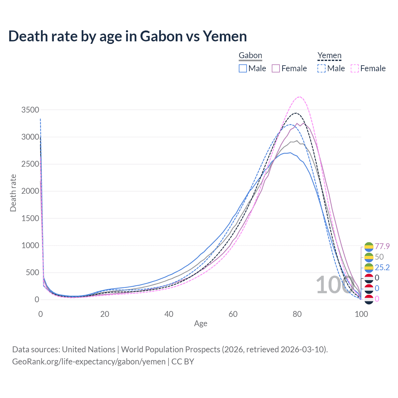 In Gabon, the most common age of death is 80, compared to 80 in Yemen. The median age of death is 73.9 in Gabon and 74.9 in Yemen, meaning only half of each cohort is expected to live past that age.