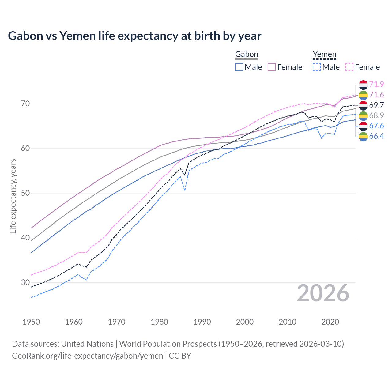 The average life expectancy at birth is 68.9 years in Gabon vs 69.7 in Yemen. Gabon is ranked 147/197 by life expectancy, and Yemen is 138/197. In Gabon, the life expectancy is 66.4 years for males and 71.6 years for females. In Yemen, it's 67.6 years for males and 71.9 years for females.