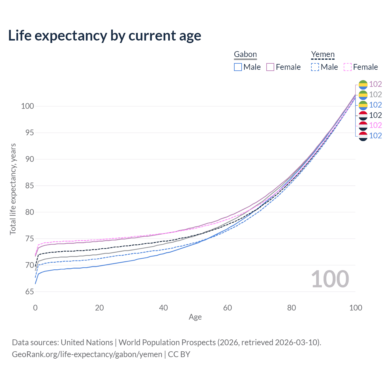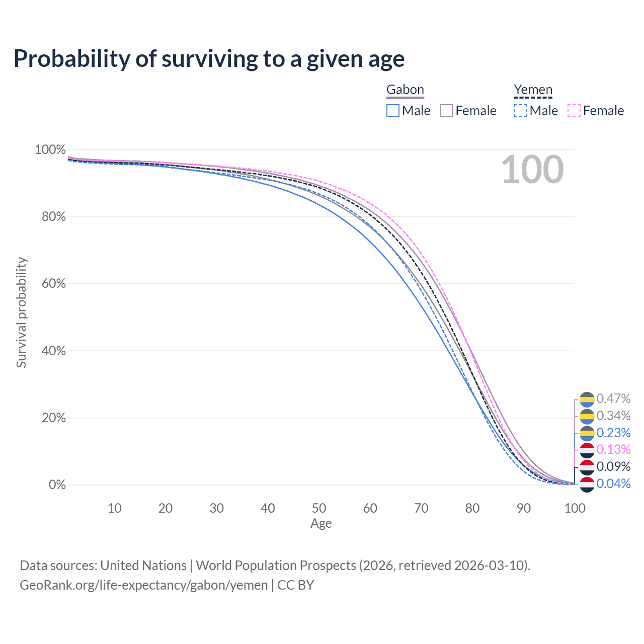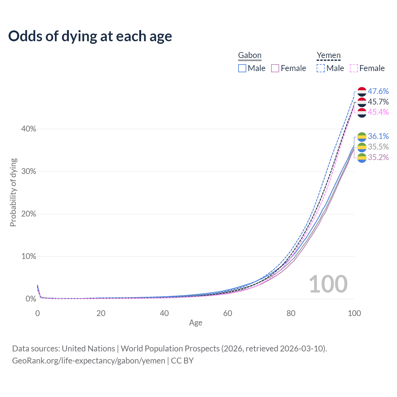 This life expectancy calculator shows the odds of living to 100, 95, 90, and below based on current age for both males and females in Gabon and Yemen, along with mean and median age of death. The calculations are based on the 2026 life tables (actuarial tables) from the UN World Population Prospects.