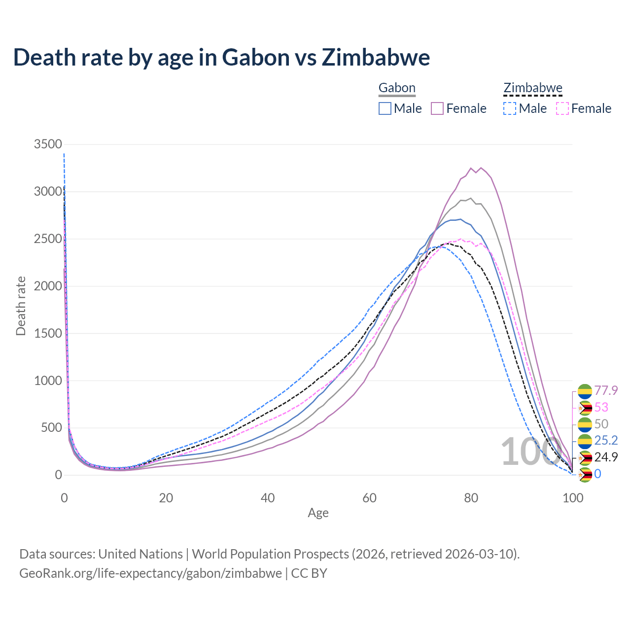 In Gabon, the most common age of death is 80, compared to 0 in Zimbabwe. The median age of death is 73.9 in Gabon and 68.8 in Zimbabwe, meaning only half of each cohort is expected to live past that age.
