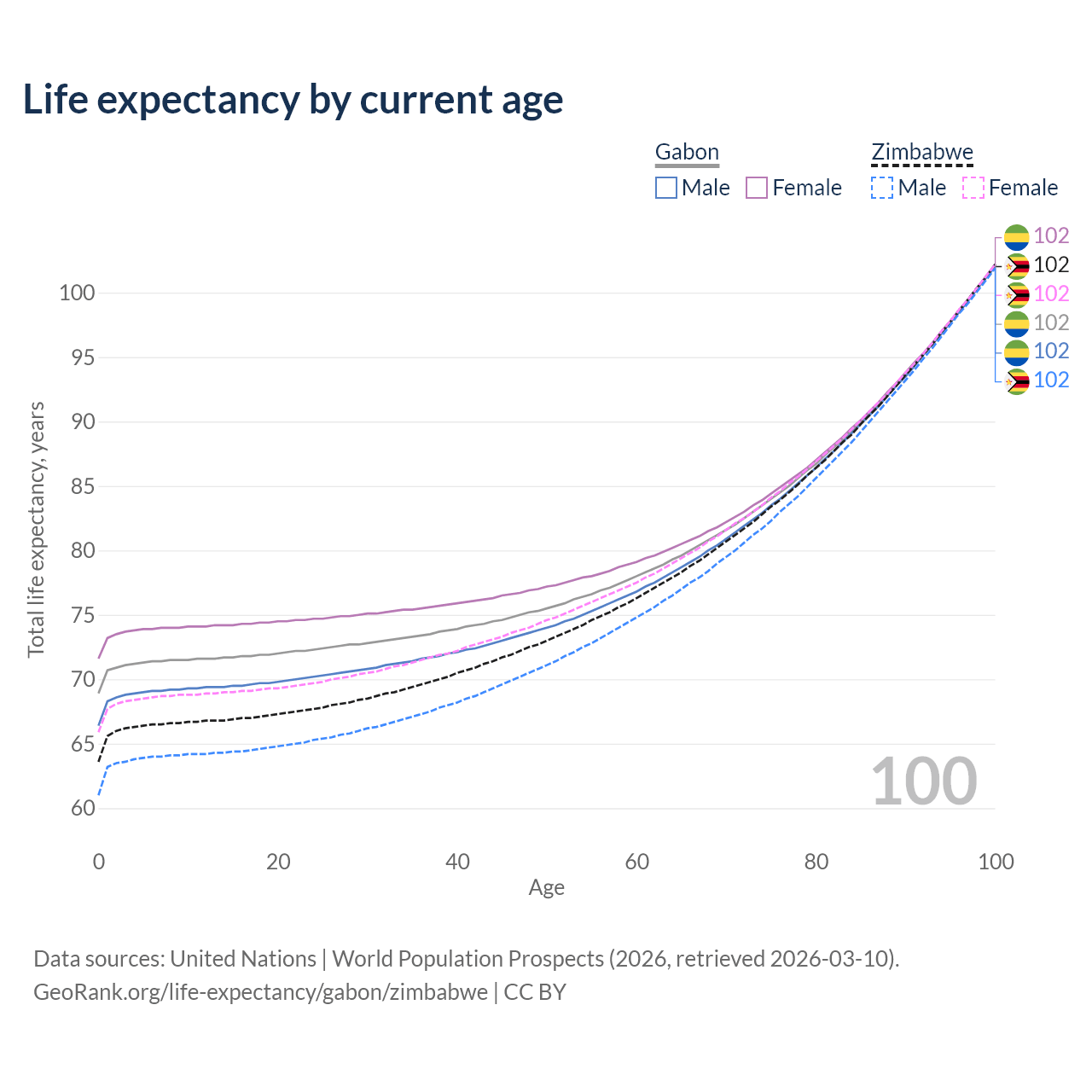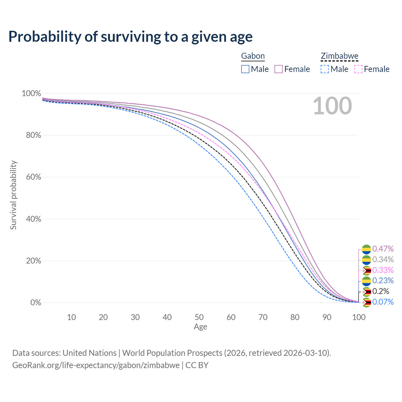 This life expectancy calculator shows the odds of living to 100, 95, 90, and below based on current age for both males and females in Gabon and Zimbabwe, along with mean and median age of death. The calculations are based on the 2026 life tables (actuarial tables) from the UN World Population Prospects.