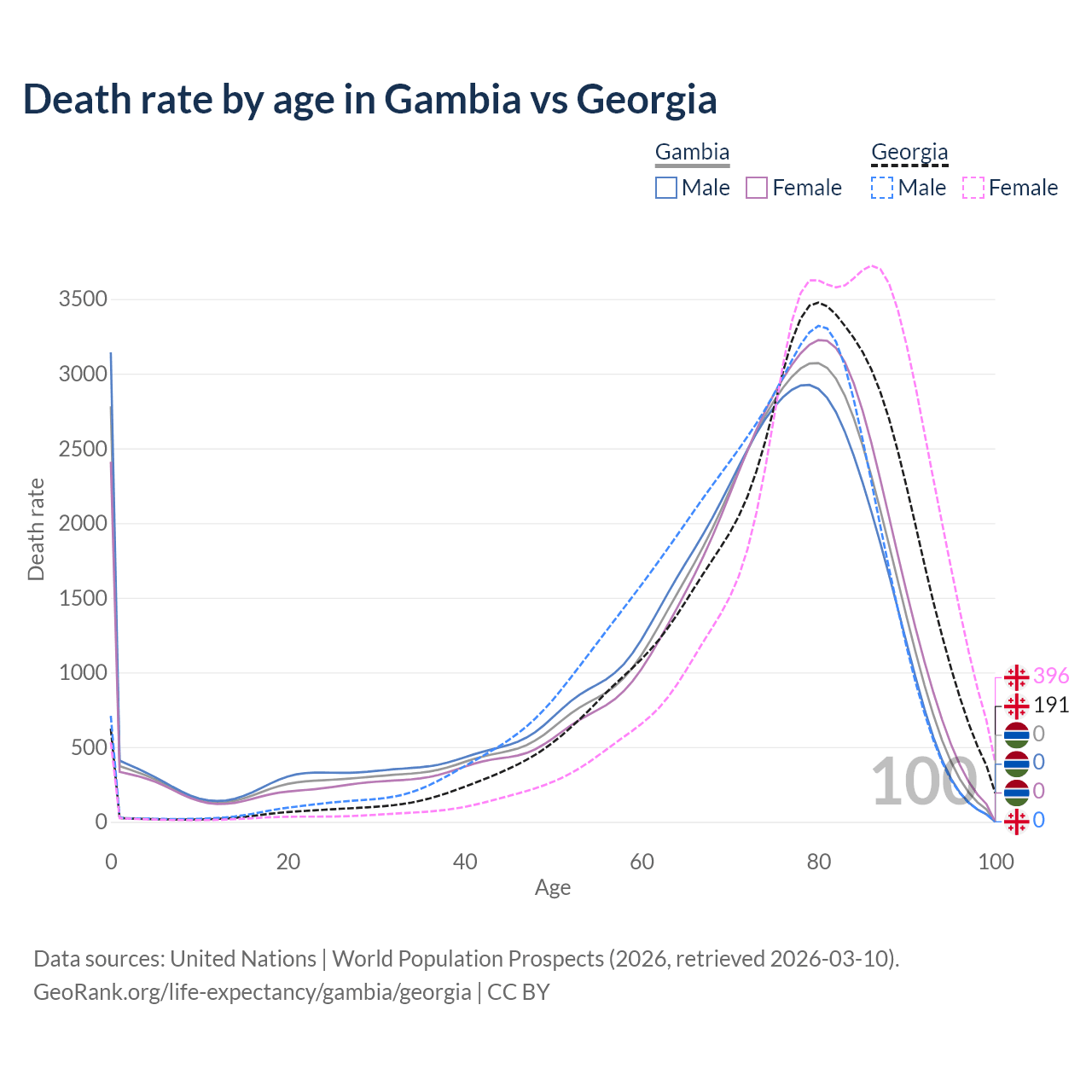 This life expectancy calculator shows the odds of living to 100, 95, 90, and below based on current age for both males and females in the Gambia and Georgia, along with mean and median age of death. The calculations are based on the 2026 life tables (actuarial tables) from the UN World Population Prospects.