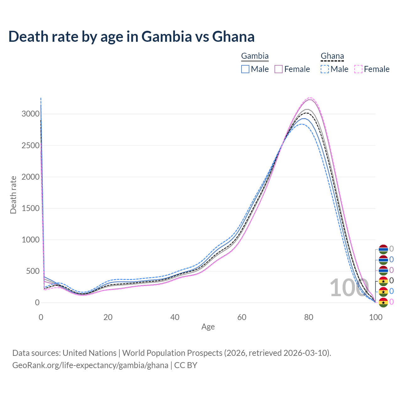 The average life expectancy at birth is 66.5 years in the Gambia vs 66.1 in Ghana. The Gambia is ranked 167/197 by life expectancy, and Ghana is 169/197. In the Gambia, the life expectancy is 64.7 years for males and 68.2 years for females. In Ghana, it's 63.7 years for males and 68.6 years for females.