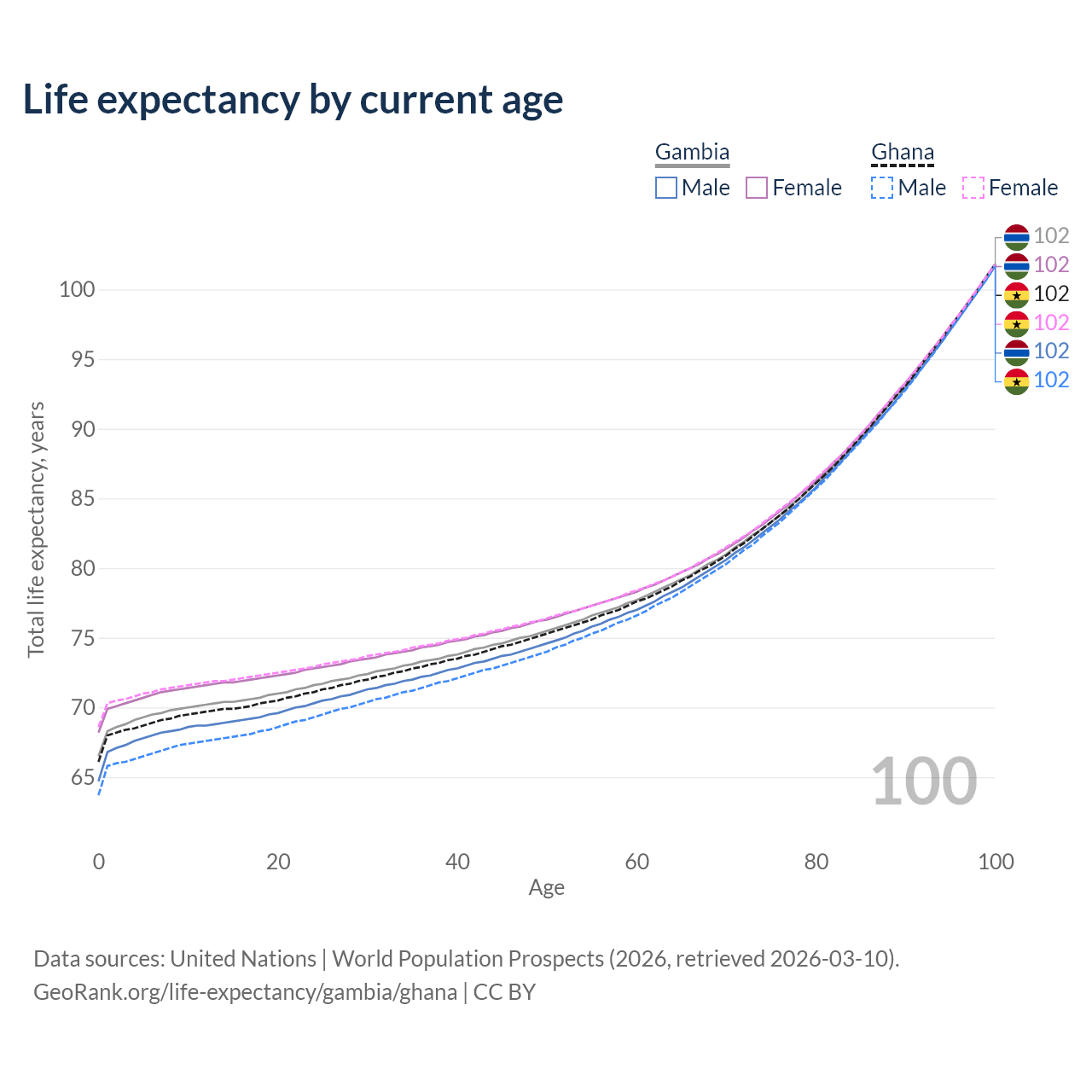 This life expectancy calculator shows the odds of living to 100, 95, 90, and below based on current age for both males and females in the Gambia and Ghana, along with mean and median age of death. The calculations are based on the 2026 life tables (actuarial tables) from the UN World Population Prospects.