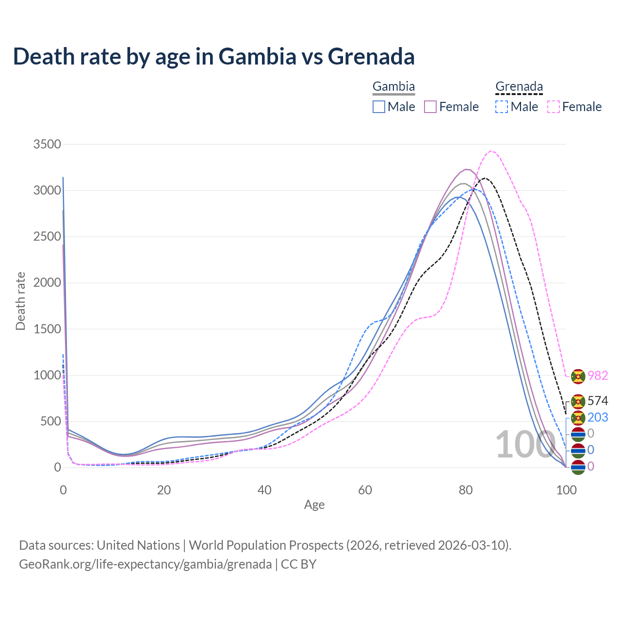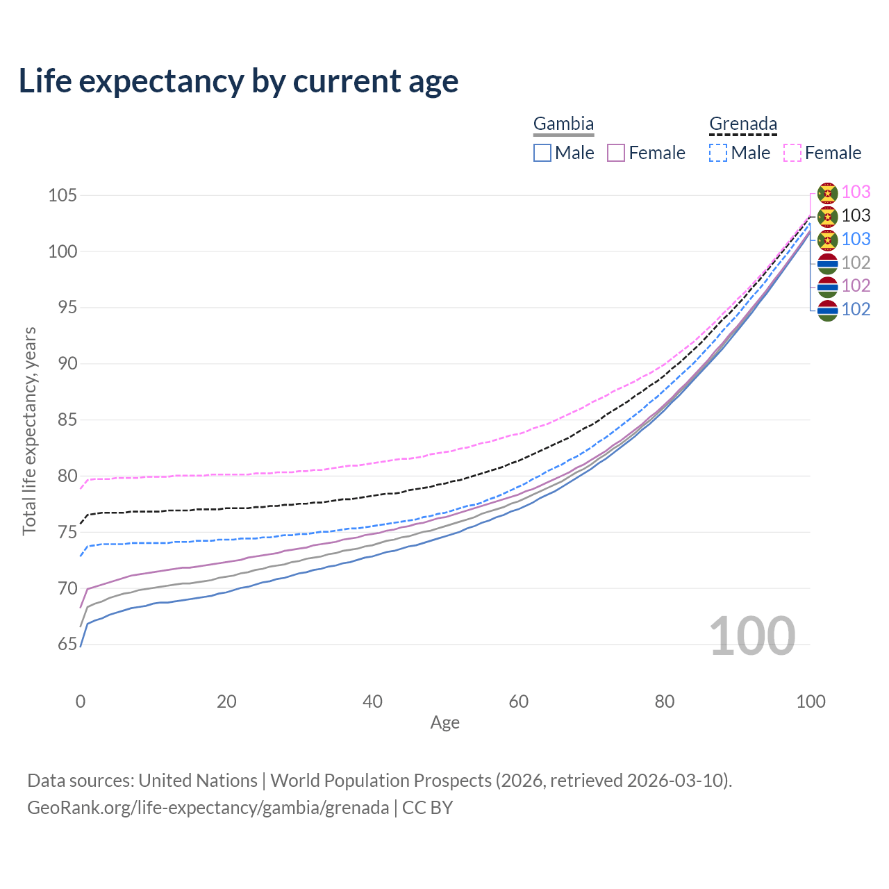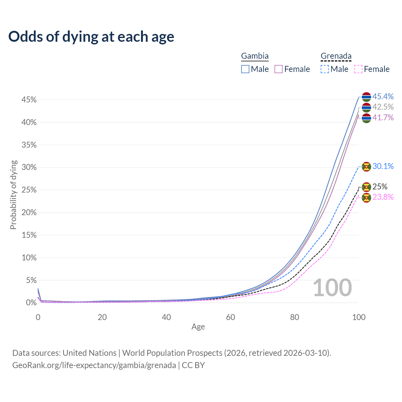 This life expectancy calculator shows the odds of living to 100, 95, 90, and below based on current age for both males and females in the Gambia and Grenada, along with mean and median age of death. The calculations are based on the 2026 life tables (actuarial tables) from the UN World Population Prospects.