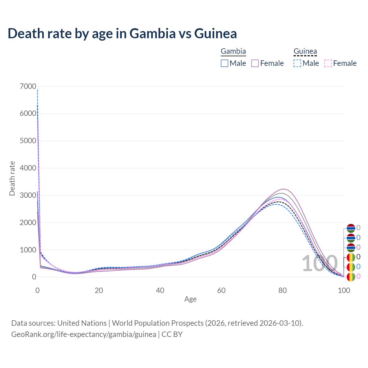This life expectancy calculator shows the odds of living to 100, 95, 90, and below based on current age for both males and females in the Gambia and Guinea, along with mean and median age of death. The calculations are based on the 2026 life tables (actuarial tables) from the UN World Population Prospects.