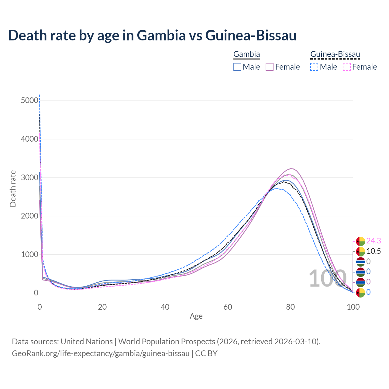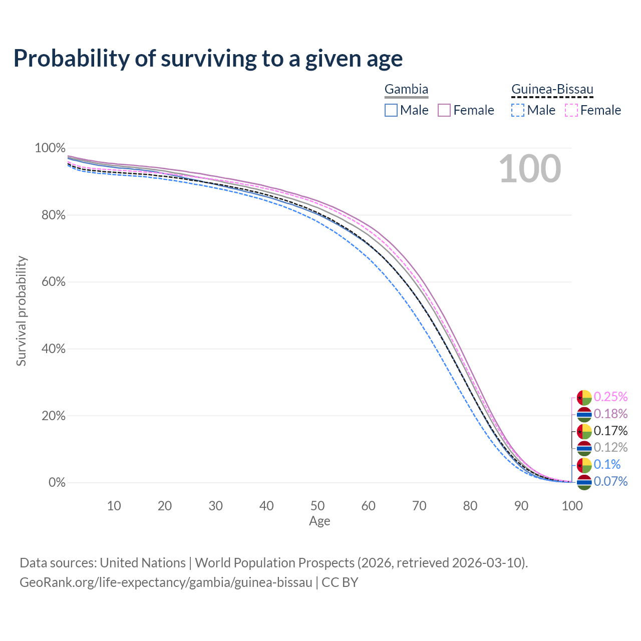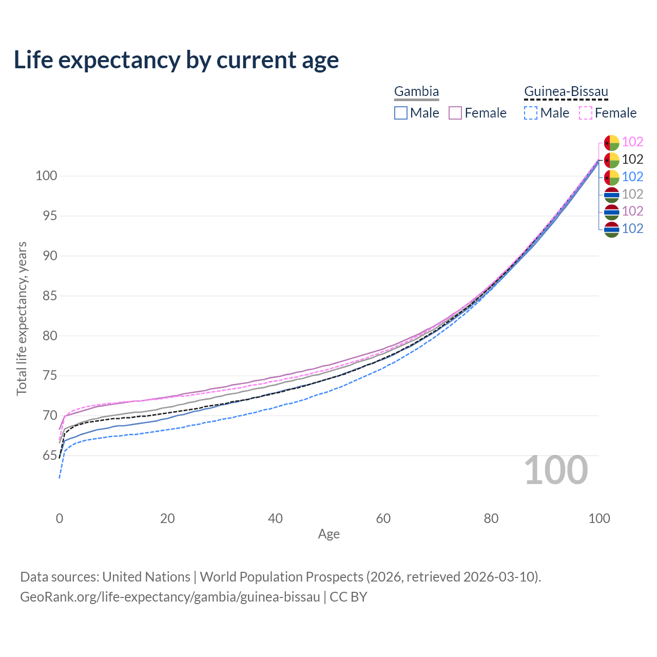 This life expectancy calculator shows the odds of living to 100, 95, 90, and below based on current age for both males and females in the Gambia and Guinea-Bissau, along with mean and median age of death. The calculations are based on the 2026 life tables (actuarial tables) from the UN World Population Prospects.