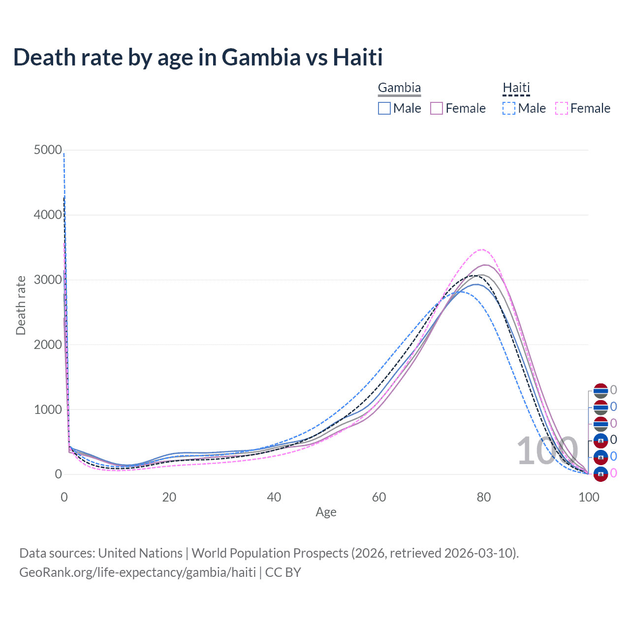 In the Gambia, the most common age of death is 80, compared to 0 in Haiti. The median age of death is 73.4 in the Gambia and 72 in Haiti, meaning only half of each cohort is expected to live past that age.