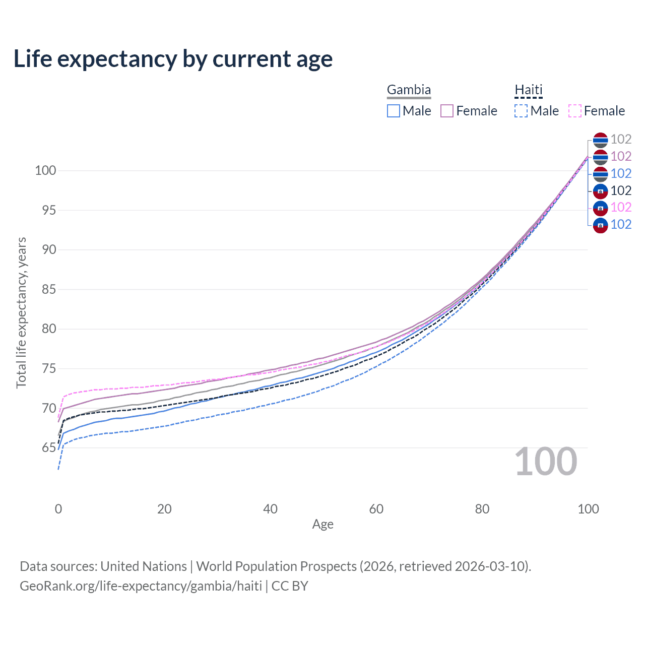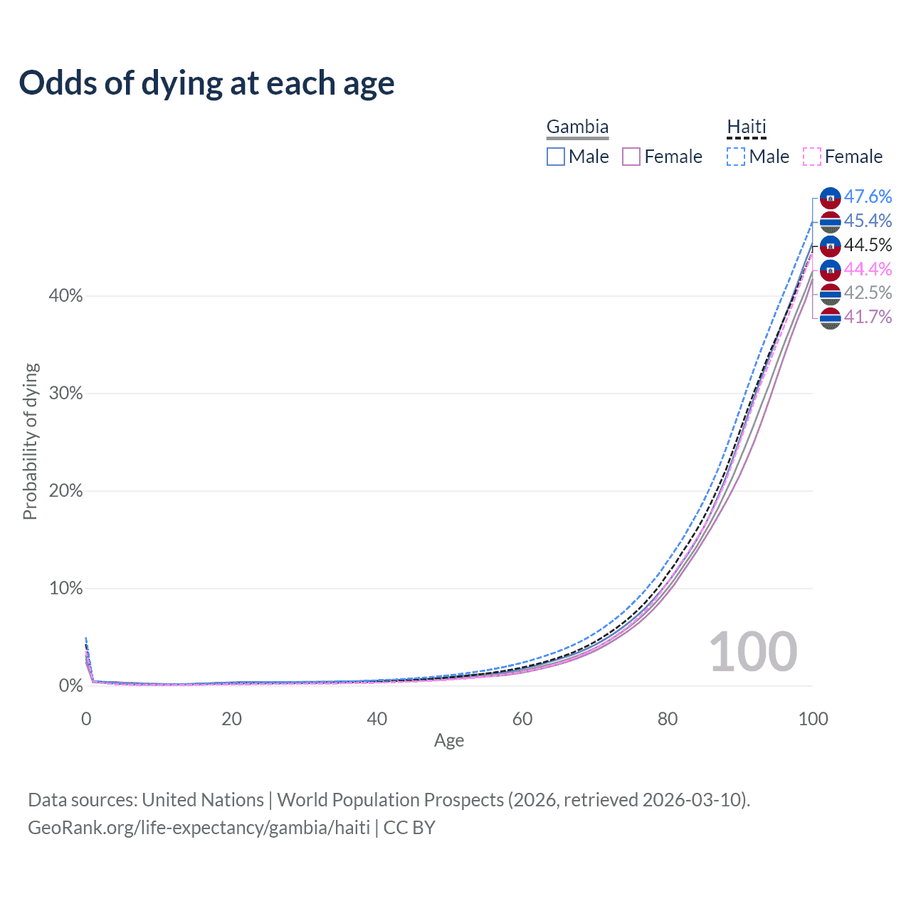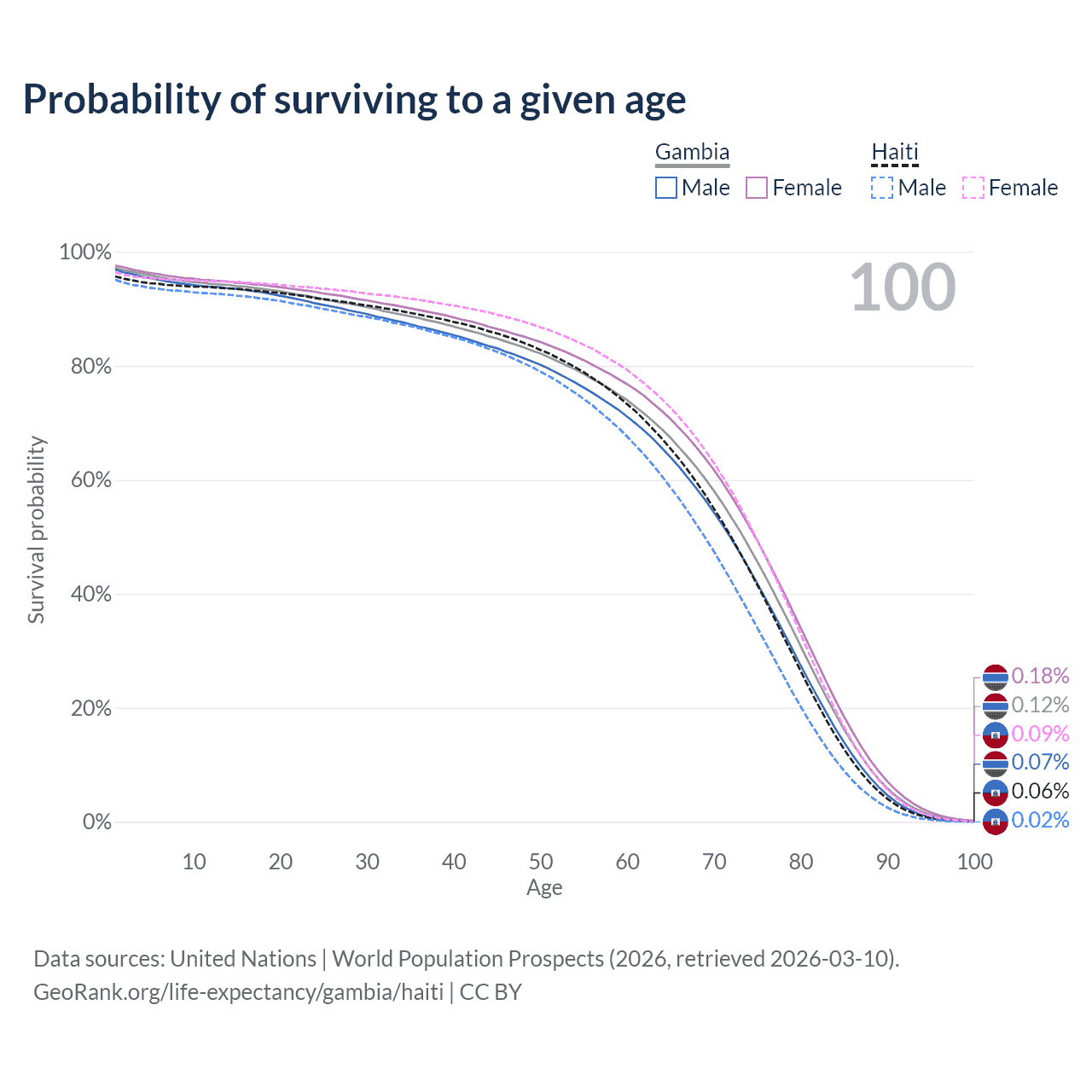 This life expectancy calculator shows the odds of living to 100, 95, 90, and below based on current age for both males and females in the Gambia and Haiti, along with mean and median age of death. The calculations are based on the 2026 life tables (actuarial tables) from the UN World Population Prospects.