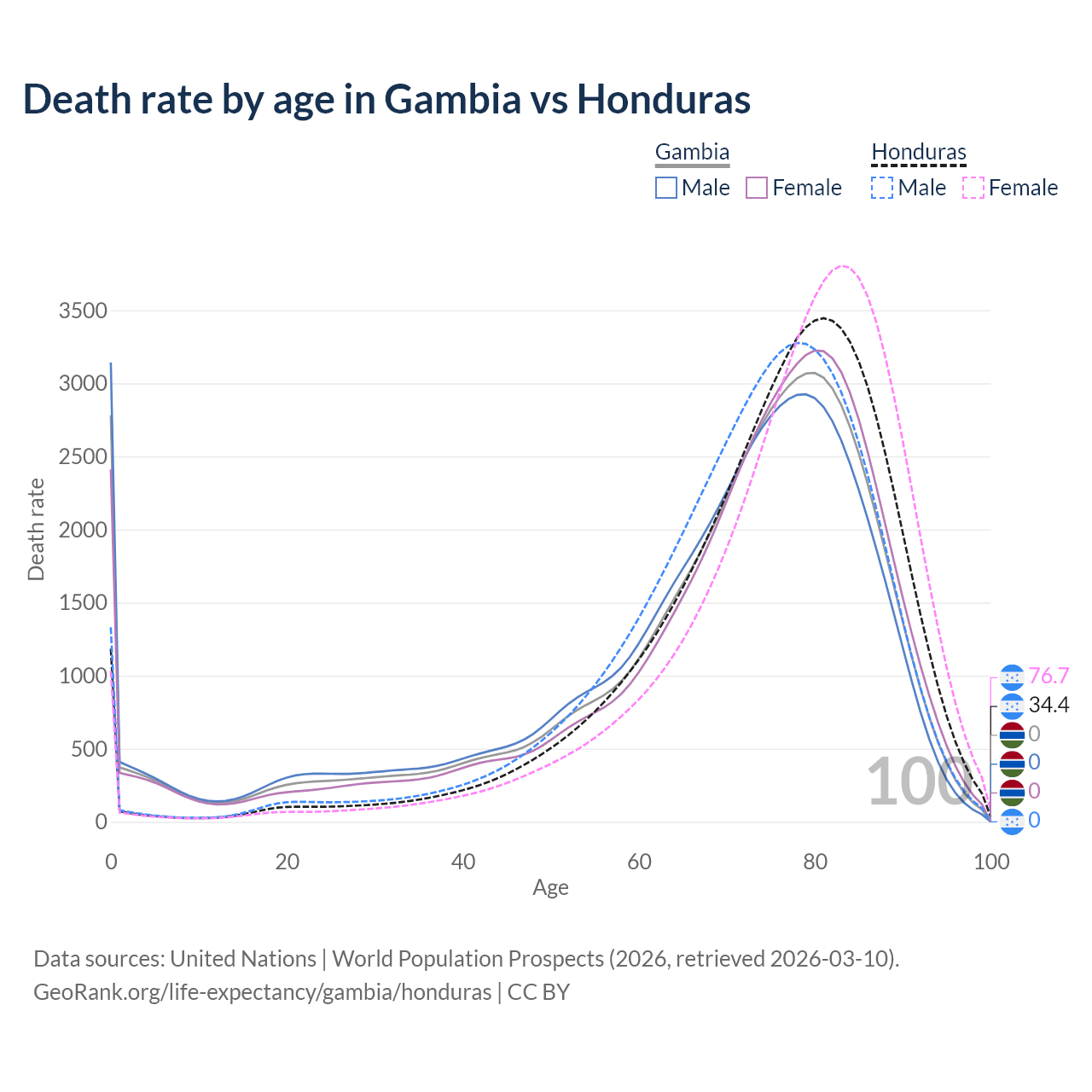 In the Gambia, the most common age of death is 80, compared to 81 in Honduras. The median age of death is 73.4 in the Gambia and 77.1 in Honduras, meaning only half of each cohort is expected to live past that age.