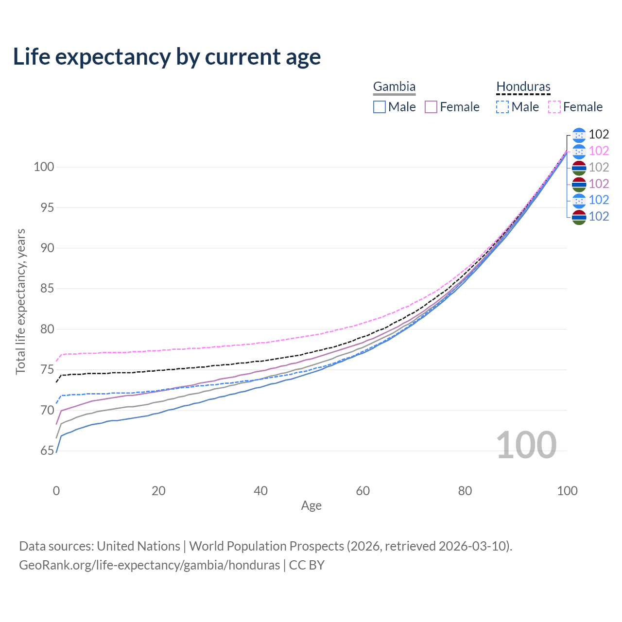 This life expectancy calculator shows the odds of living to 100, 95, 90, and below based on current age for both males and females in the Gambia and Honduras, along with mean and median age of death. The calculations are based on the 2026 life tables (actuarial tables) from the UN World Population Prospects.