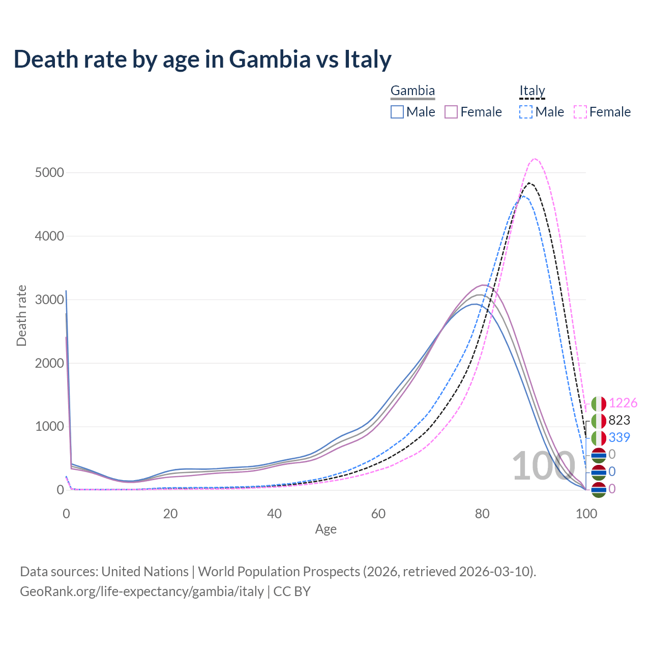In the Gambia, the most common age of death is 80, compared to 89 in Italy. The median age of death is 73.4 in the Gambia and 86.9 in Italy, meaning only half of each cohort is expected to live past that age.