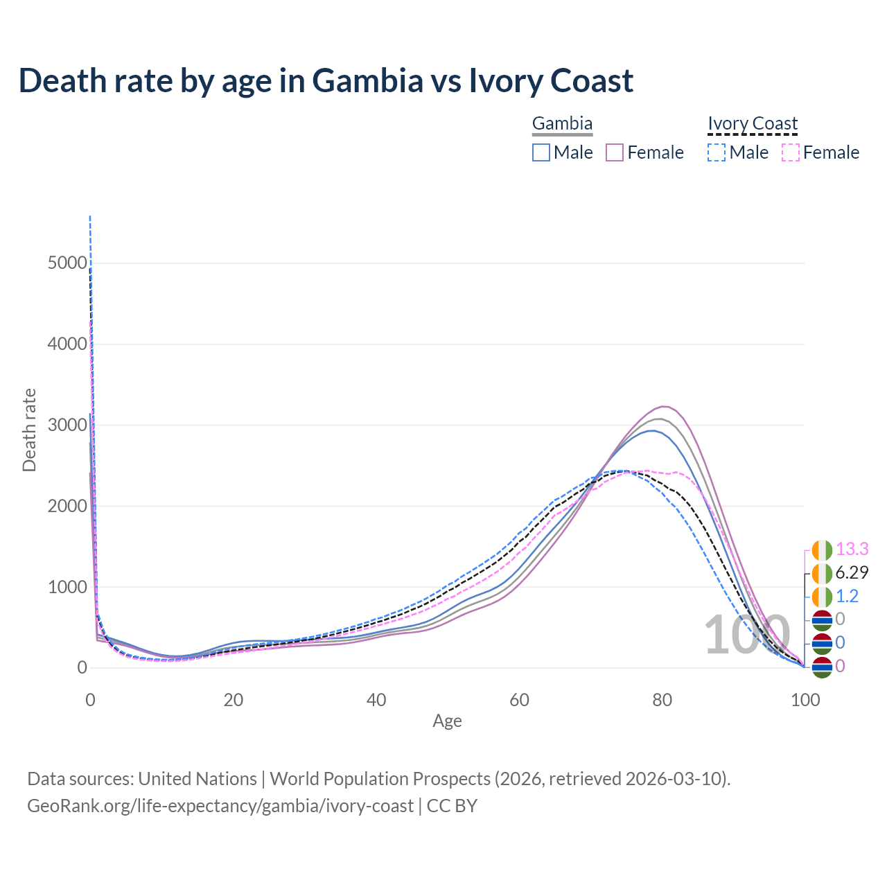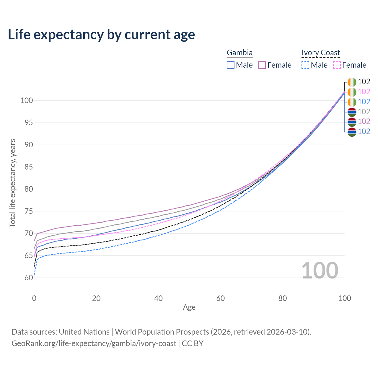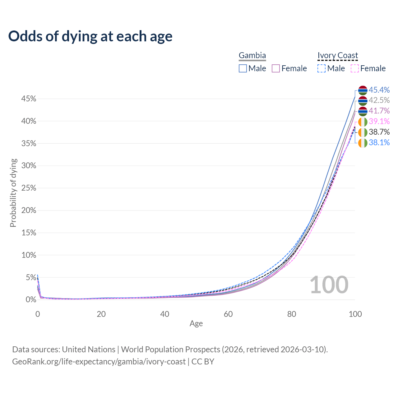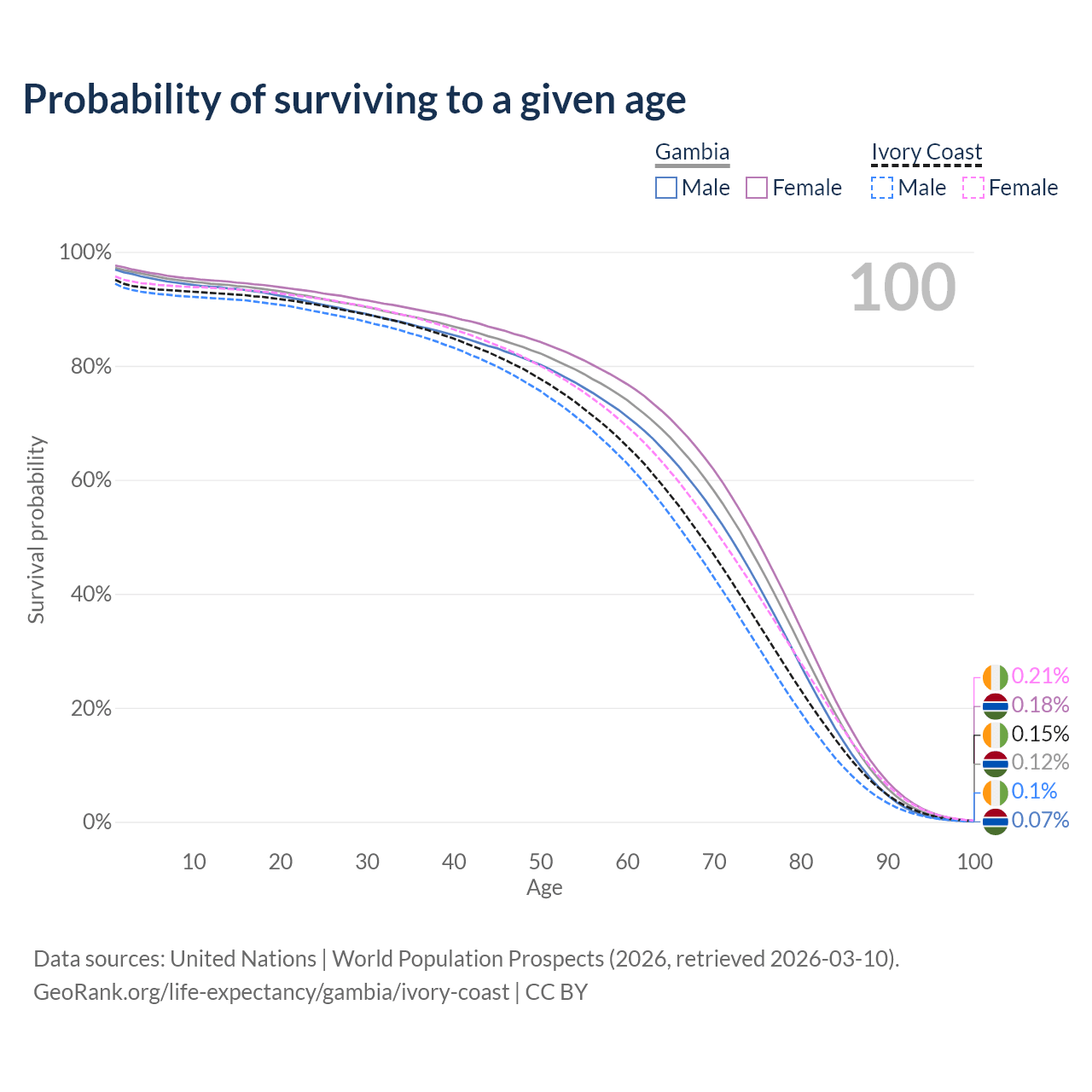 This life expectancy calculator shows the odds of living to 100, 95, 90, and below based on current age for both males and females in the Gambia and Ivory Coast, along with mean and median age of death. The calculations are based on the 2026 life tables (actuarial tables) from the UN World Population Prospects.