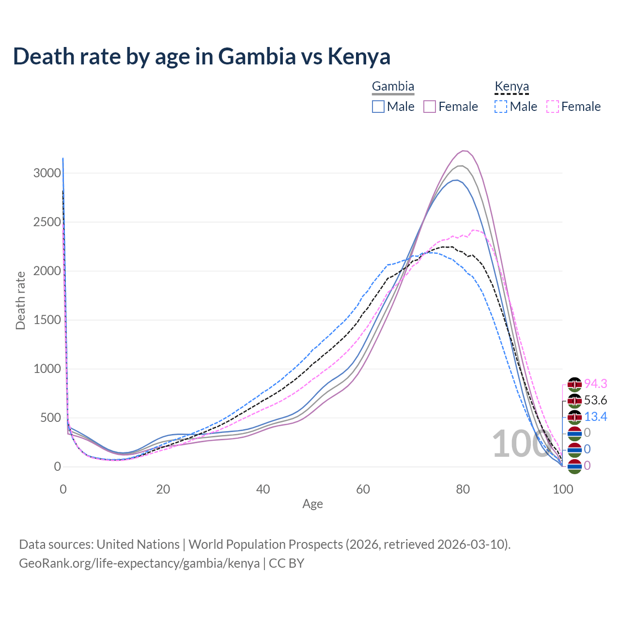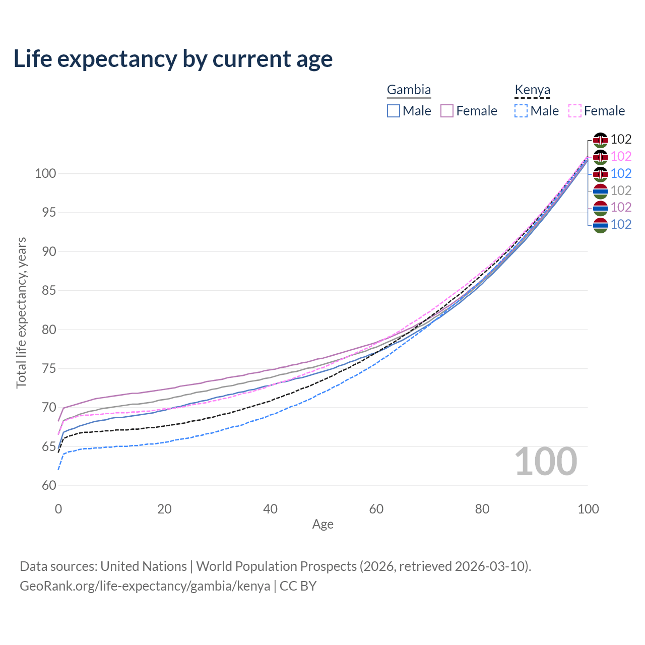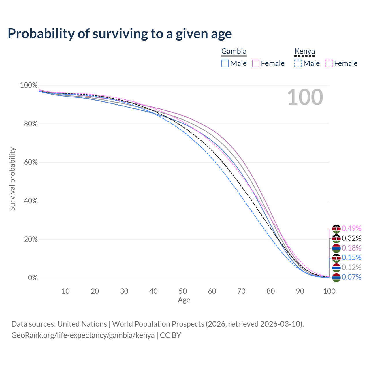 This life expectancy calculator shows the odds of living to 100, 95, 90, and below based on current age for both males and females in the Gambia and Kenya, along with mean and median age of death. The calculations are based on the 2026 life tables (actuarial tables) from the UN World Population Prospects.