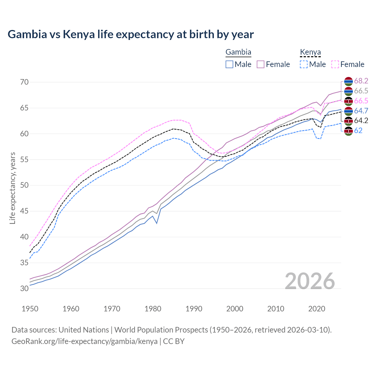 The average life expectancy at birth is 66.5 years in the Gambia vs 64.2 in Kenya. The Gambia is ranked 167/197 by life expectancy, and Kenya is 177/197. In the Gambia, the life expectancy is 64.7 years for males and 68.2 years for females. In Kenya, it's 62 years for males and 66.5 years for females.