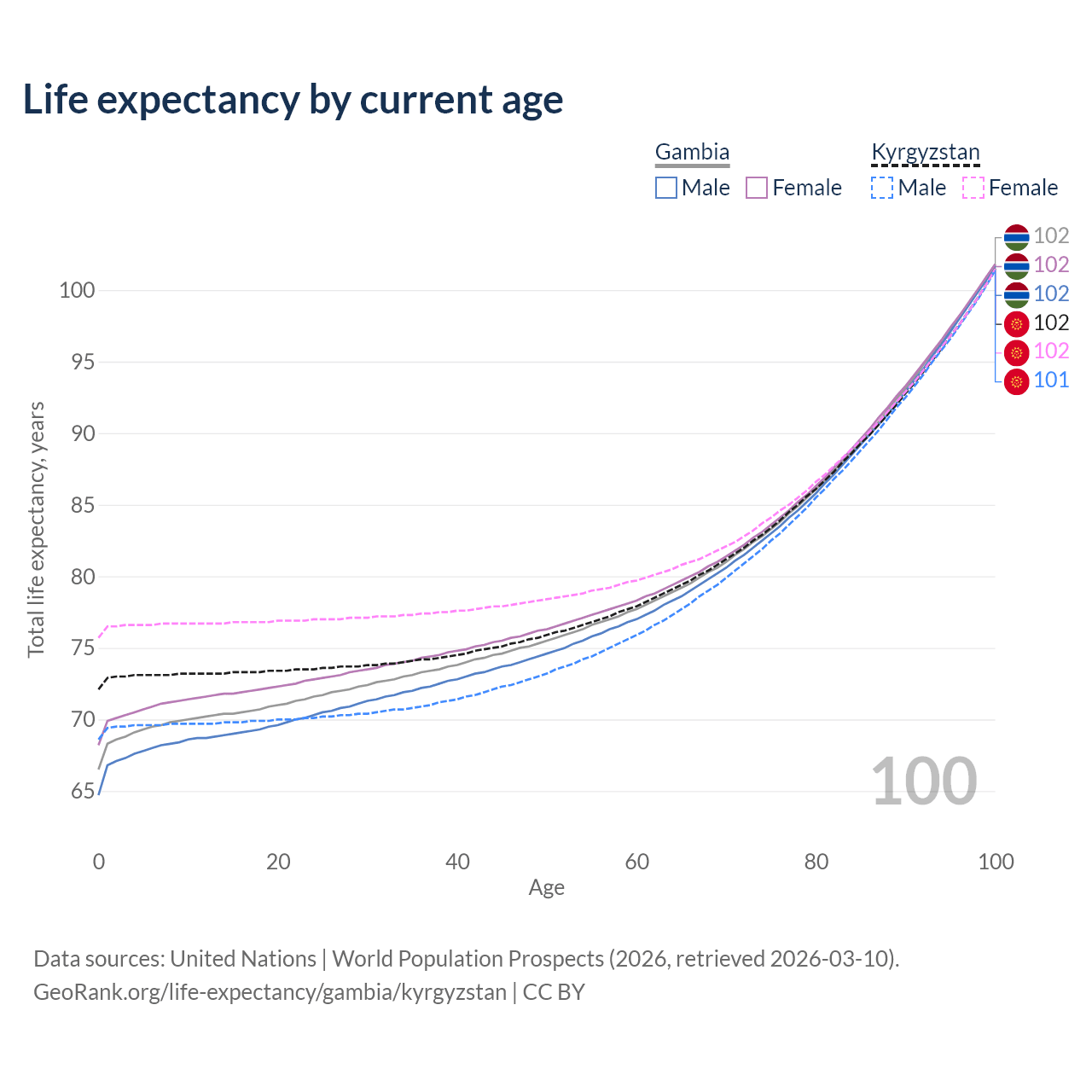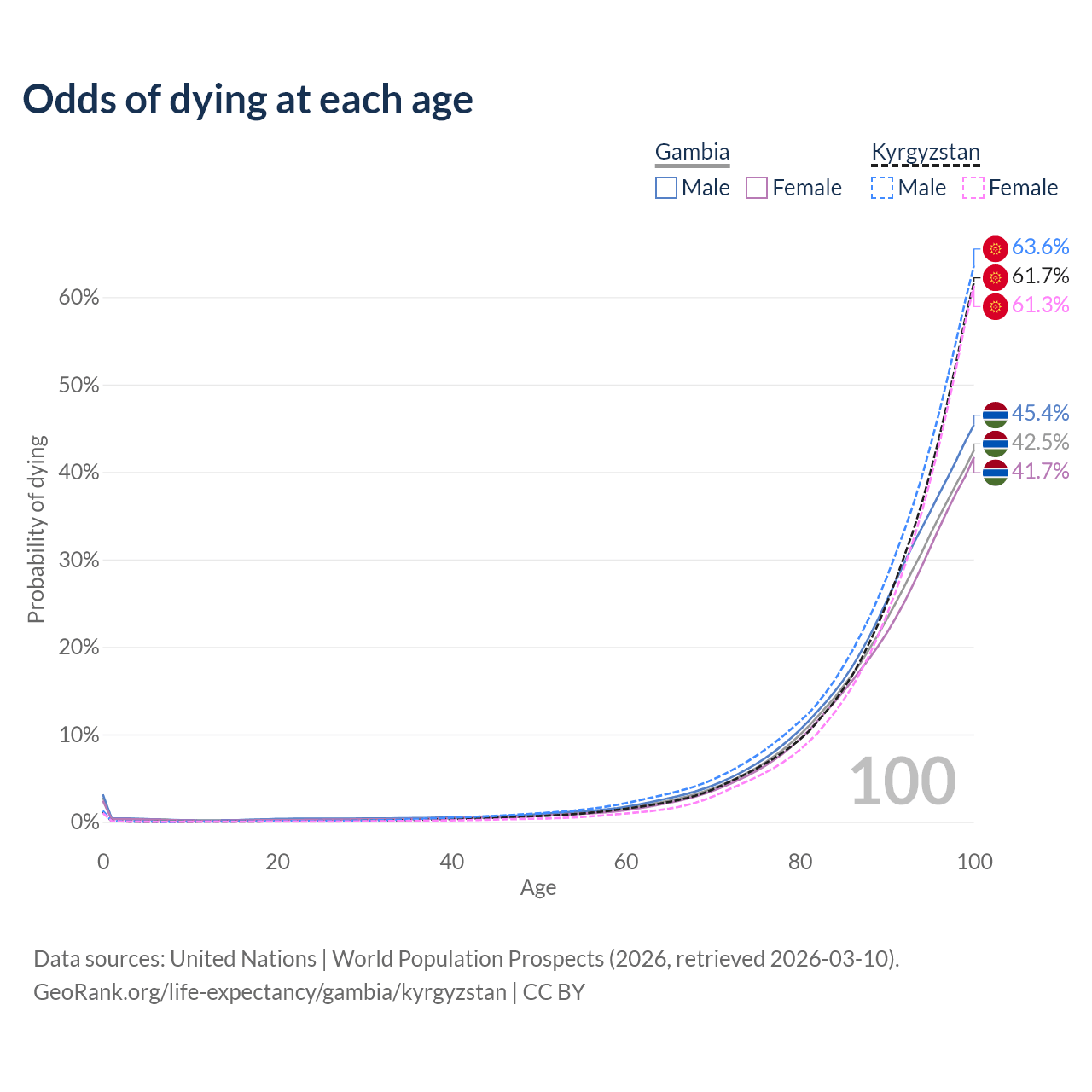 This life expectancy calculator shows the odds of living to 100, 95, 90, and below based on current age for both males and females in the Gambia and Kyrgyzstan, along with mean and median age of death. The calculations are based on the 2026 life tables (actuarial tables) from the UN World Population Prospects.
